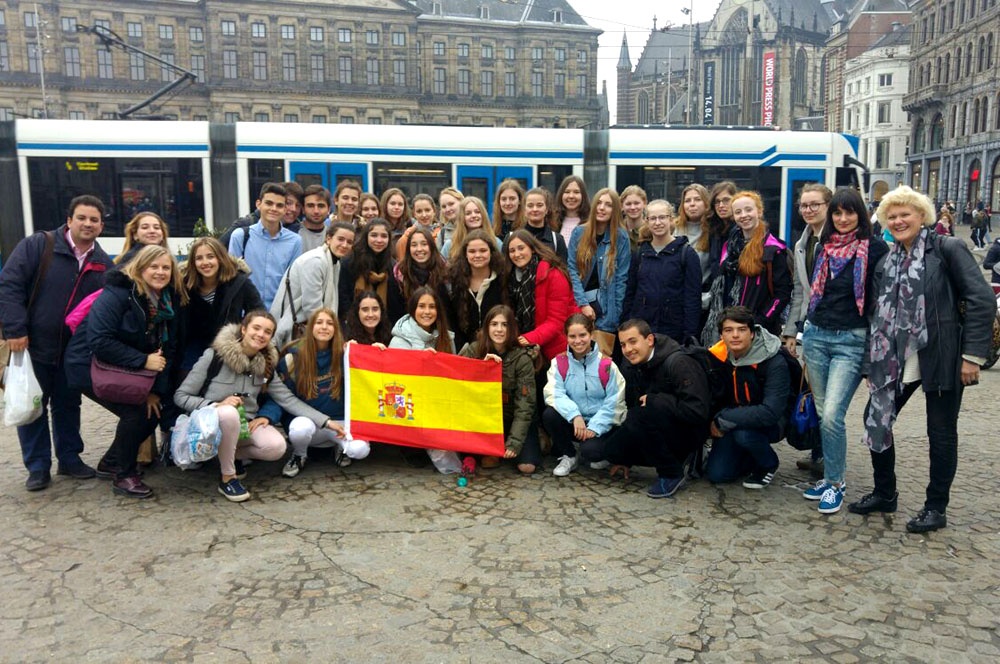 Am Mittwoch konnten die spanischen Schüler erstaunt feststellen, dass man problemlos ohne Grenzkontrollen in ein weiteres europäisches Land einreisen kann und sich außerdem auf Englisch überall in Europa verständigen kann – gelebtes Europa! In Amsterdam angekommen machten wir zuerst eine Grachtenfahrt. Durch die Erklärungen erfuhren wir viel über das Nachbarland und dessen Hauptstadt. Danach stand ein Besuch des weltbekannten Rijksmuseum auf dem Programm, wo die Schülerinnen und Schüler mithilfe einer App das Museum selbstständig erkunden konnten und Informationen über die Werke erhielten. Die Nachtwache von Rembrandt war natürlich ein Muss. In unmittelbarer Nähe zu diesem Meisterwerk befindet sich auch der Westfälische Friede von Münster und damit die bildhafte Darstellung der Geburtsstunde der Niederlande: So werden auf dem Gemälde von Bartholomäus van Helst Persönlichkeiten dargestellt, die dieses historisch bedeutsame Ereignis feiern.