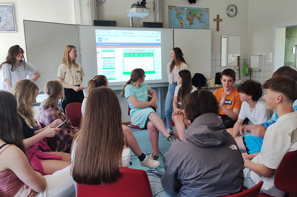 Anfang der Woche nahmen die 8er an der Präventionsveranstaltung „Infocokail Alkohol“ teil und schulten ihr Wissen rund um das Thema Alkohol. Die motivierten Referentinnen (Studentinnen des Fachbereiches soziale Arbeit bzw. Sozialpädagogik), gestellt vom Amt für Kinder, Jugendliche und Familien des Kreises Warendorf, erarbeiteten innerhalb von vier Unterrichtsstunden mit den Schülerinnen und Schülern anhand eines abwechslungsreichen und jugendorientierten Programms eine gesunde Einstellung zum Thema Alkoholkonsum und Koma-Trinken. Dabei gab es neben vielen klaren Informationen vor allem auch spielerische Einheiten wie Rollenspiele oder eine sehr eindrückliche Übung mit den sogenannten „Alkoholbrillen“, die auf amüsante Weise die Folgen exzessiven Konsums erlebbar machte, sodass vor allem der eigene Umgang mit Alkohol im Mittelpunkt stand. Abgerundet wurde die Präventionsveranstaltung mit einem abwechslungsreichen Quiz und einem insgesamt sehr positiven Feedback der beteiligten Schülerinnen und Schüler sowie Hr. Flothkötter als schulischer Suchtbeauftragter.
