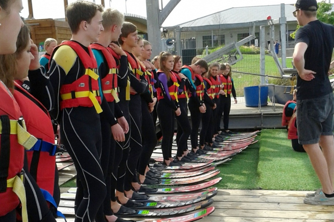 Rund 40 angehenden Abiturientinnen und Abiturienten der Sportkurse von Frau Blömker, Herrn Rössl und Herrn Sure haben am vergangenen Mittwoch buchstäblich ihre Bodenhaftung aufgegeben und sich auf Wasserski gewagt, die für sie zunächst aber nur wackelige Bretter waren.