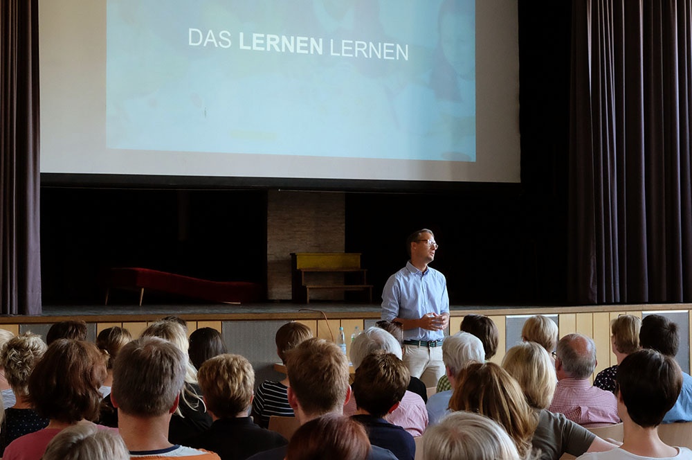 Klang die Vorankündigung des Vortrags recht wissenschaftlich nüchtern, so vermochte der Referent des gemeinnützigen Vereins "LVB Lernen" aus Berlin in unterhaltsamer Weise den anwesenden Eltern die Zusammenhänge von Lerntechniken, Lerntypen, Motivation und Kommunikation zu verdeutlichen.
