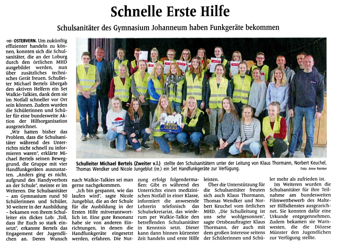 Schulsanitäter des Gymnasium Johanneum haben Funkgeräte bekommen