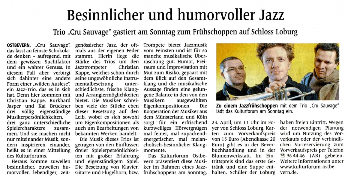 Trio "Cru Sauvage" gastiert am Sonntag zum Frühschoppen auf Schloss Loburg