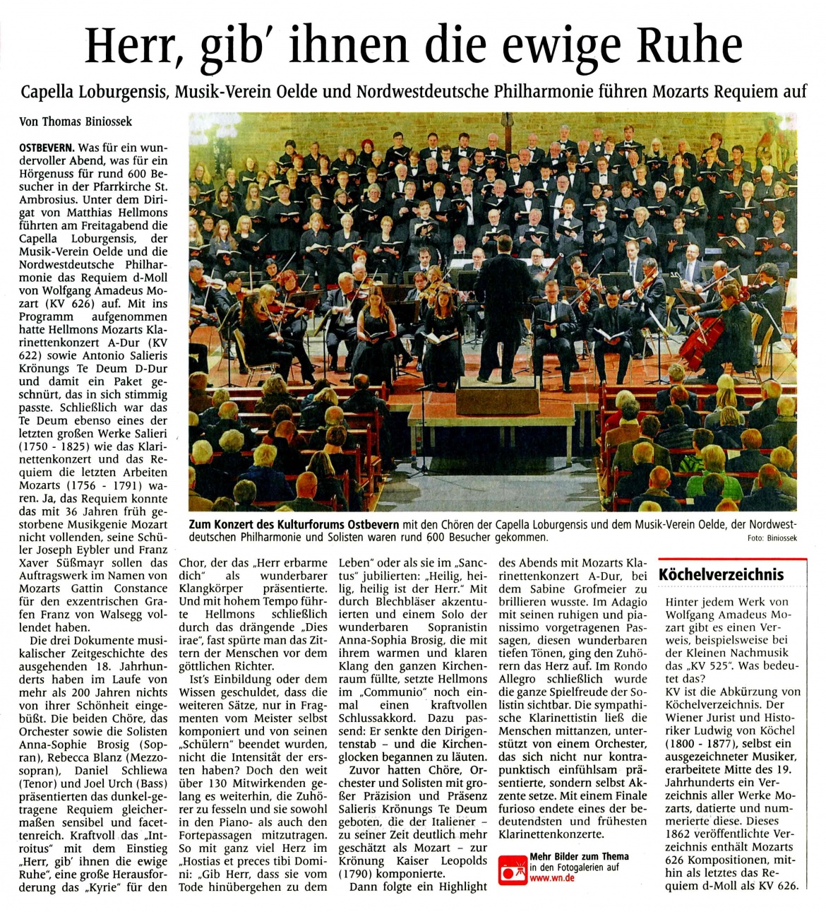 Capella Loburgensis, Musik-Verein Oelde und Nordwestdeutsche Philharmonie führen Mozarts Requiem auf