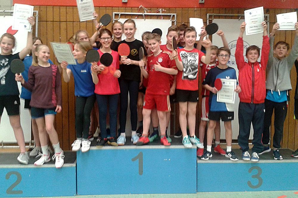 Bei der diesjährigen Auflage des Bezirksturniers im Tischtennisrundlauf („Milchcup“) schnitten unsere Schulteams hervorragend ab. Wie schon beim schulinternen Turnier im Dezember zeigten sich „The wild bunch“ aus der 6c, „Die wilden Raketen“ aus der 6a, „The Kings“ aus der 5a und „Die wilden Wimpern“ aus der 5c auch auf Telgter Parkett als eingespielte Teams – alle vier zogen nach erfolgreichen Vorrundenspielen in die Hauptrunde ein.