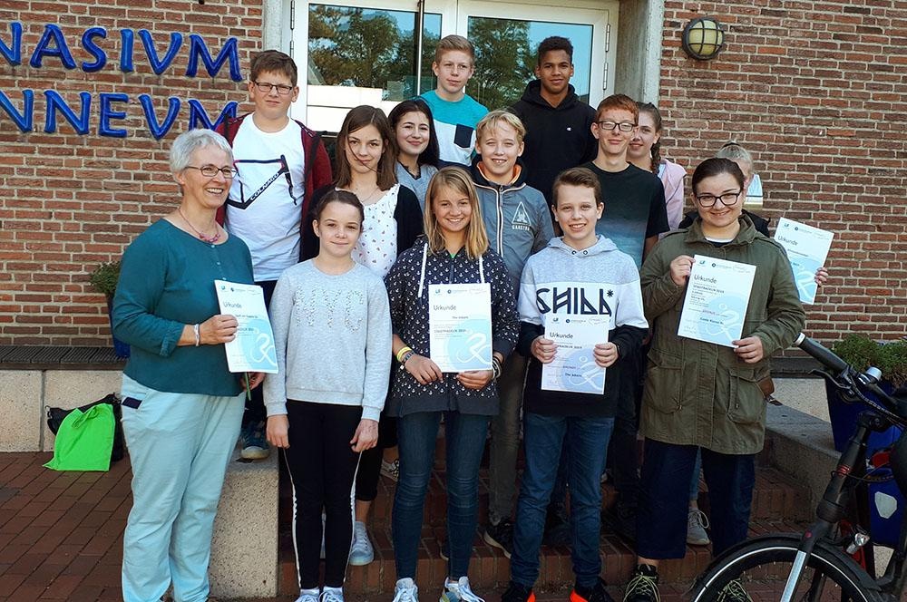 - Die Klasse 5 b (Team "Spaß am Radeln") war besonders erfolgreich. Sie belegte Platz 2 bei den Schülerteams und ebenfalls Platz 2 bei den Teams mit den meisten Teilnehmern. Sie konnte sich über einen Gesamtgewinn von 150 € freuen. Davon will die Klasse die Hälfte des Geldes erneut (wie in einem früheren Beitrag berichtet) für ein Fahrradprojekt in Uganda spenden.