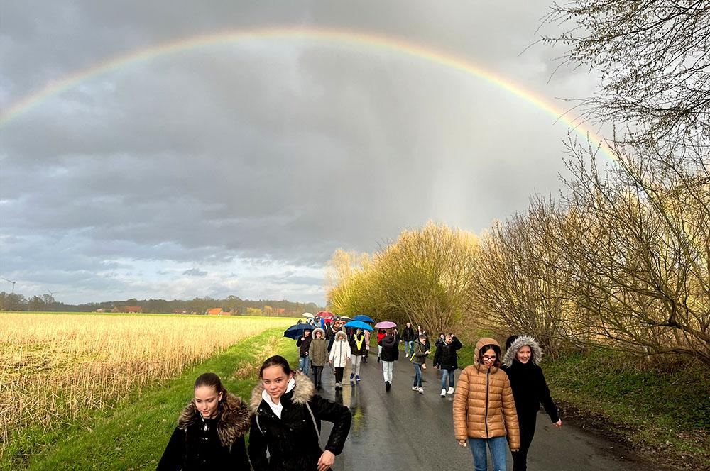 Im Anschluss an den Gottesdienst machten sich die Loburger auf zu einem 6 Kilometer langen Fußmarsch. Dieser führte über die Höfe Stallmann, Hugenroth und Mersbäumer. An den jeweiligen Stationen erwartete die Teilnehmer*innen jeweils eine Kreuzwegstation. Unter teils widrigen Wetterumständen trotzten die Teilnehmer*innen gelegentlichem Wind und Regen und wurden dafür mit einem schönen Regenbogen belohnt.