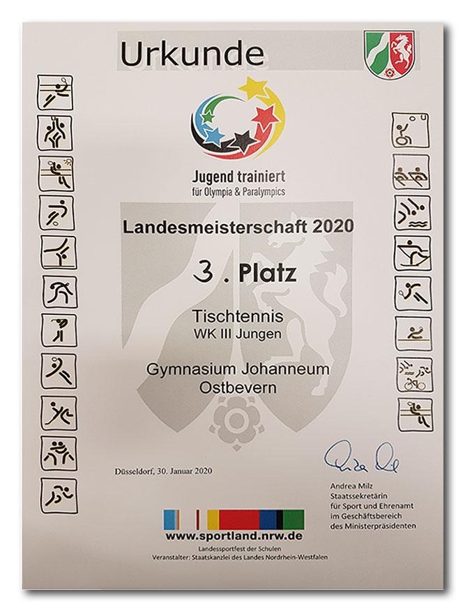 Betreut wurde die Mannschaft von Markus Raveaux und Marco Rolf (Sporthelfer). Die Spiele waren alle auf hohem Niveau und wie erwartet knapp. Von den vier Spielen konnte das Team Loburg zwei souverän gewinnen und musste sich nur knapp den Schulen aus Erftstadt und dem späteren Sieger aus Gütersloh geschlagen geben. Diese beeindruckende Leistung reichte somit für den verdienten 3. Platz. Mit Medaille und Pokal fuhren Leif Grünkemeier, Thomas Jahn, Eliah Lönker, Noah Taylor Mannig, Timo Rolf, Falco Ruetz und Simon Schulze Topphoff stolz wieder zur Loburg zurück und niemand bereute, dass er statt 8 Stunden zur Schule 13 Stunden zum Tischtennisfinale gefahren war.