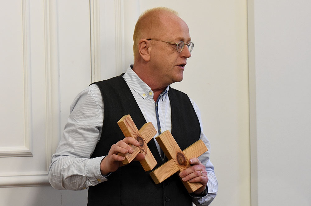 Franz-Josef und Georg wurden sie selten genannt, und das weist schon darauf hin, wie eng sie beide eingebunden waren in das Loburger Miteinander. Daher konnte ihrem Wunsch nach einem lautlosen Abschied auch nicht ganz entsprochen werden. Der Schulleiter betonte aber, dass seine Rede eigentlich keine sei, die Fachvorsitzenden versteckten das, was sie sagen wollten, in einem Rollenspiel und dann wurde auch noch gesungen und alle KollegInnen stimmten mit ein. So ließen es sich Jupp und Schorsch dann doch nicht nehmen, den Versammelten einiges Nettes aber auch Nachdenkliches mit auf den Weg zu geben. Heiter wurde es dann noch, als das B-Team, ein Fahrradgruppe erfahrener Kollegen, die in den letzten 18 Jahren Deutschland gemeinsam erkundet haben, sich mit launigen Worten von Ihrem Gründungsmitglied Schorsch Wolf verabschiedete. Unser Schulseelsorger schaffte es dann noch, den in den Mittelpunkt zu rücken, der uns und die beiden verdienten Pädagogen in den letzten Jahrzehnten begleitet hat und dies wohl auch weiterhin tut. Wolfgang Rensinghoff überreichte zwei Kreuze, die er selbst aus dem Holz des Loburger Dachstuhls gefertigt hatte.