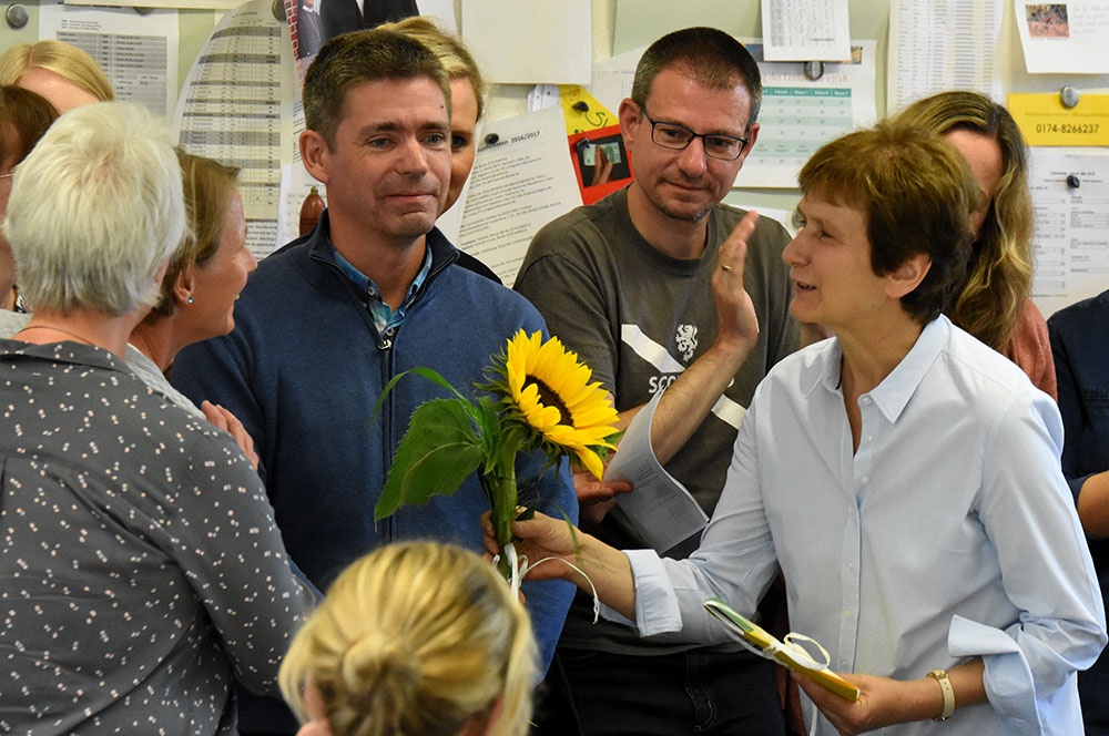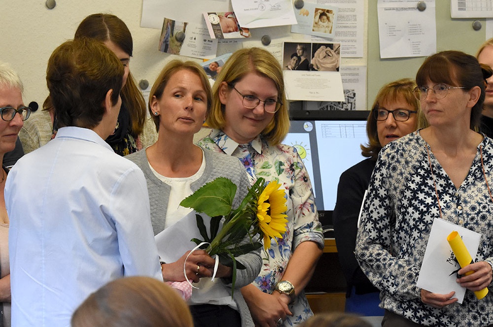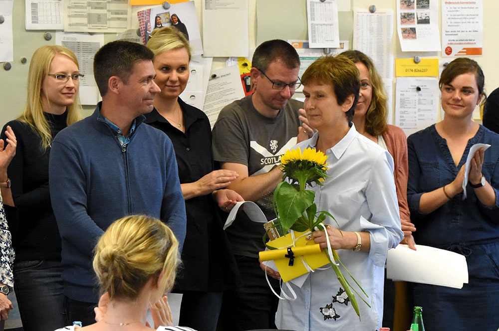 So verabschiedeten sich die Fachschaften von dem Genuss- und Kulturmenschen Marianne Grave-Wolf mit sehr persönlichen Geschenken, die gemeinsam mit der jeweiligen Fachschaft einzulösen sind. Auch ihre Sitznachbarinnen im Lehrerzimmer werden Frau Grave-Wolf als Freundin, mit der man Gespräche weit über den small-talk hinaus führen konnte, vermissen und luden sie, damit der Kontakt nicht abreißt, zu einem gemeinsamen Frühstück ein.