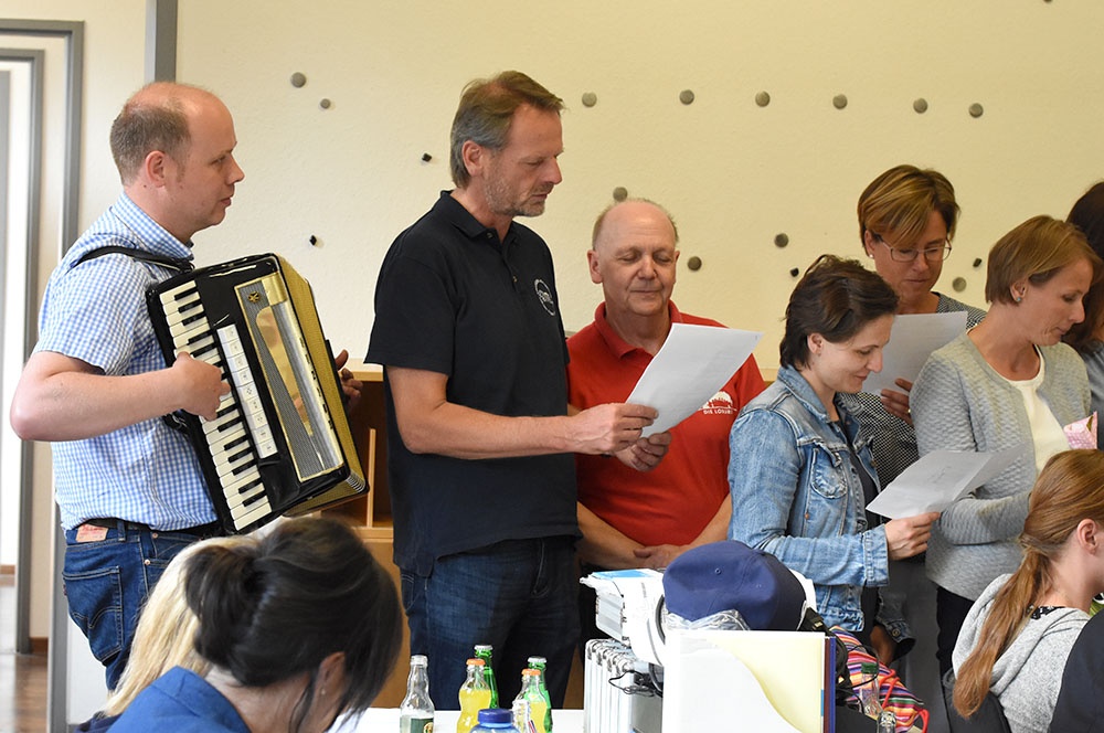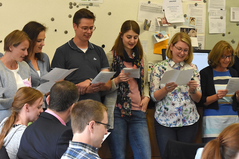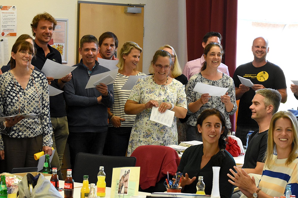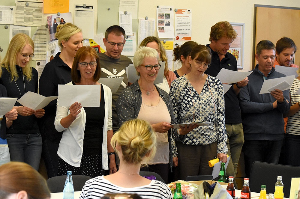 Die Fachschaften legten ihren Fokus auf die außerunterrichtlichen Aktivitäten. Ein Chor aus Mitgliedern ihrer Fachschaften Deutsch und Biologie trugen derlei Facetten aus ihrem Lehrerleben amüsant und gekonnt unter der Leitung von Jan-Dirk Frönd nach der Melodie "... eine Seefahrt, die ist lustig!“ vor.