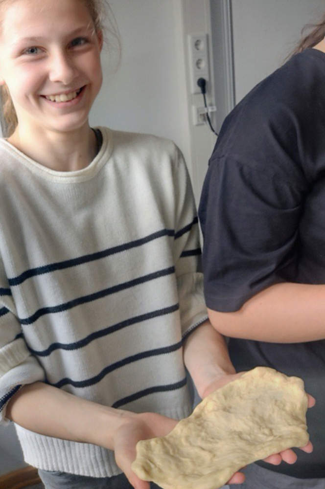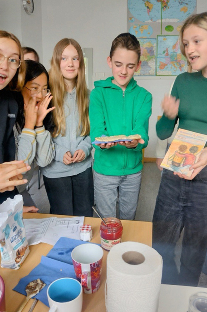 Wie war wohl die Stimmung auf dem Marktplatz? „Man wird es gerochen haben, die Kinder haben bestimmt gespielt und genascht, die Frauen sich auch unterhalten“, vermuteten die Schüler:innen. Genau dieses Szenario konnten wir 10 Minuten später im Klassenraum beobachten, als der Kurs seine eigenen Fladenbrote gebacken hat. Auch 2000 Jahre später immer noch köstlich!