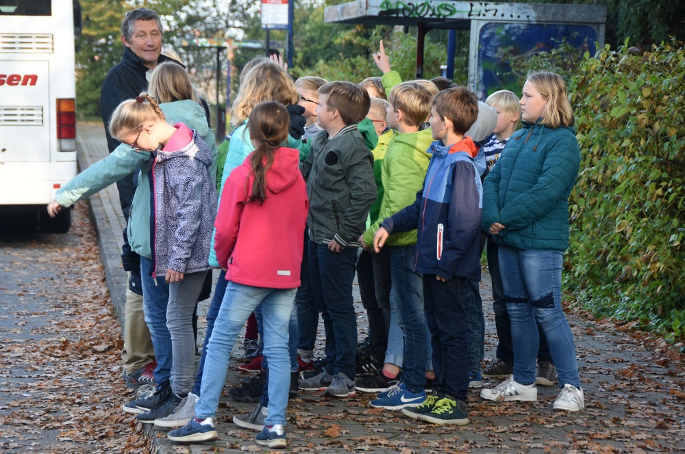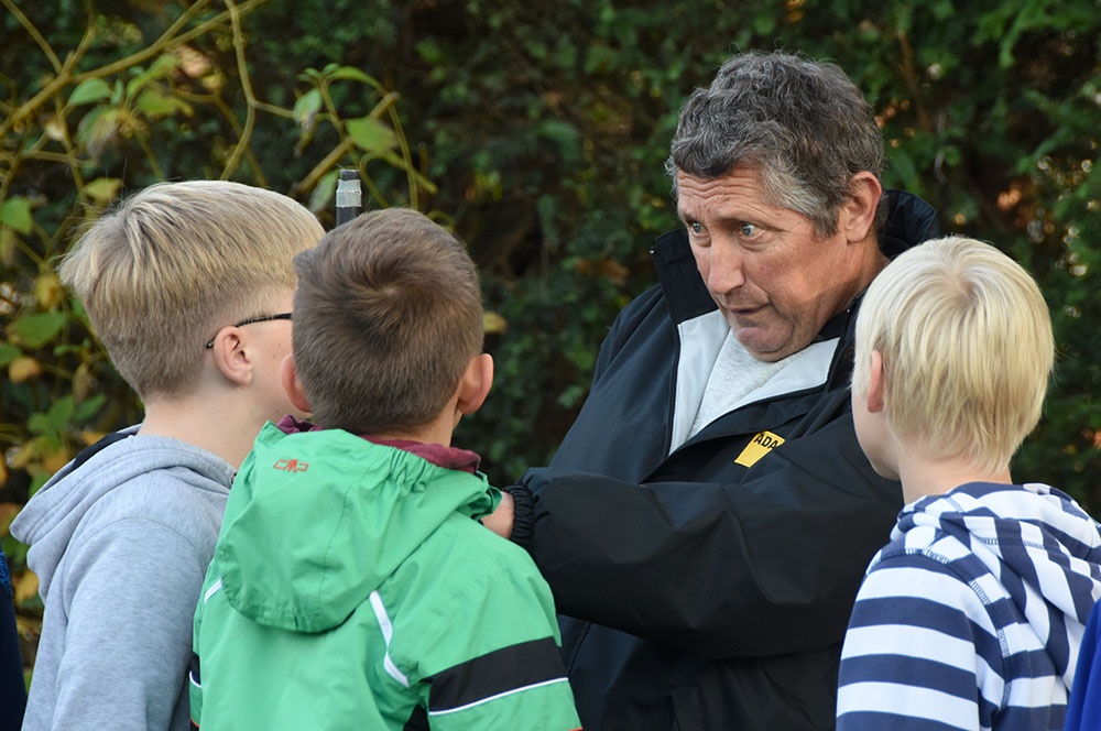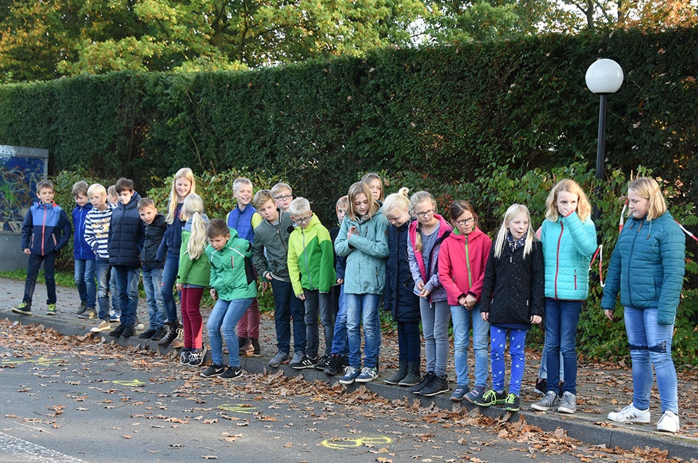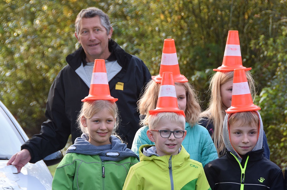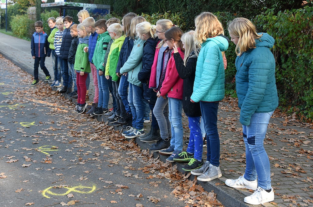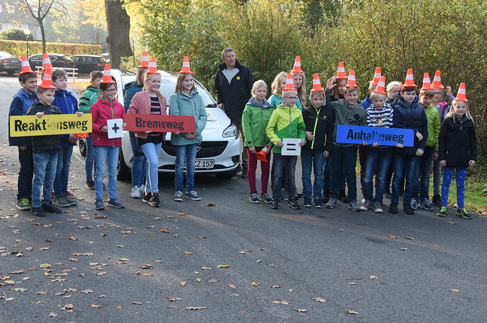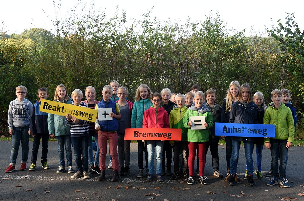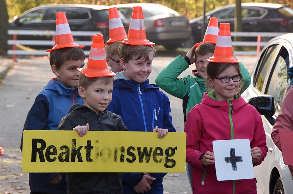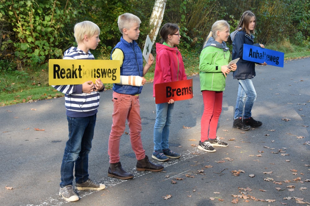 In der vierten Stunde hatten die Schülerinnen und Schüler bei schönstem Wetter die Gelegenheit, reale Verkehrssituationen handlungsorientiert zu erleben. Die Kinder lernten vor allem durch praktische Übungen und Demonstrationen. Sie erlebten den Zusammenhang zwischen Geschwindigkeit, Reaktionszeit und Bremsweg, auch in Abhängigkeit von verschiedenen Fahrbahnzuständen, und konnten so den Anhalteweg von Fußgängern und Fahrzeugen besser einschätzen.
