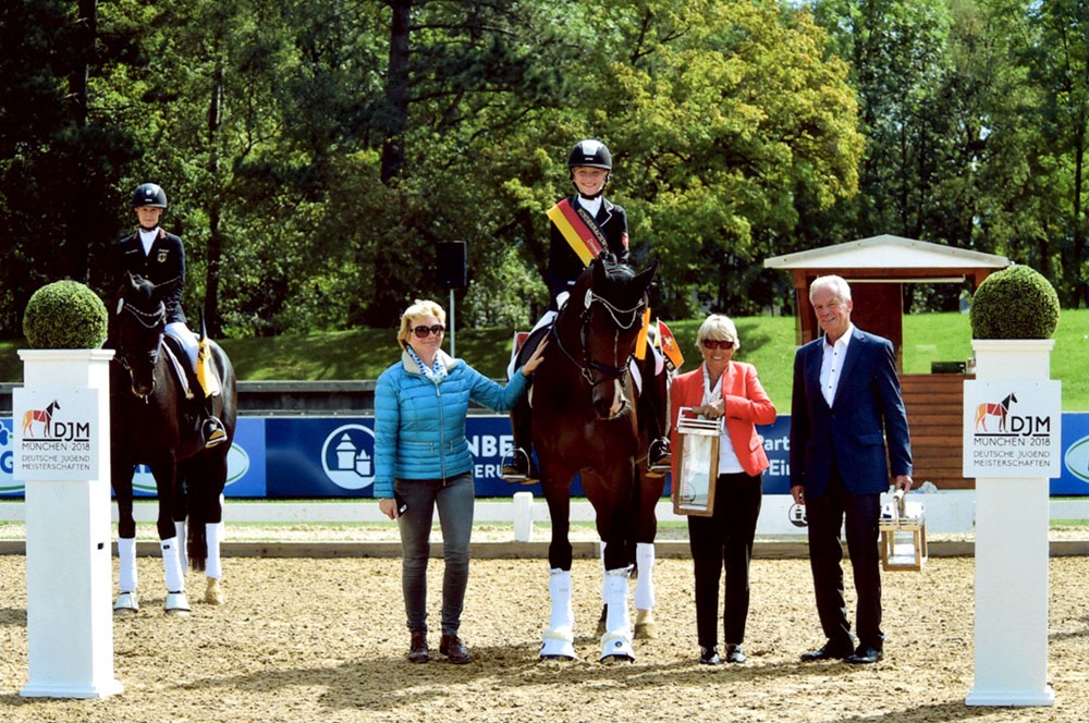Ein Platz auf dem Treppchen war den drei Finalistinnen im Finale des Liselott Rheinberger-Nachwuchsförderpreises schon sicher. Vorher mussten sich die drei Talente allerdings der Dressurreiterprüfung Kl. L mit Pferdewechsel im großen Münchner Viereck stellen. Ganz nach vorne ritt am Ende Michelle Moß aus dem Landesverband Weser-Ems, die sowohl auf ihrer Stute Dancing Queen als auch auf den Pferden ihrer Konkurrentinnen Top-Ritte hinlegte. Zweite wurde Alina Hahn aus Baden-Württemberg vor Olivia Schmitz-Morkramer aus Schleswig-Holstein.