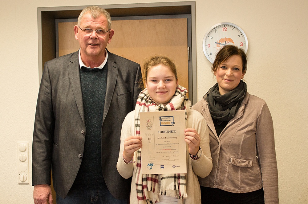 Maybrit Freudenberg (Klasse 7b) hat sich dieser Herausforderung gestellt, indem sie in der Experimentier AG eine Briefwaage gebaut und diese skaliert hat. Auch die Fragestellung, wie man mit zwei Fahrradscheinwerferlampen, zwei Rücklichtlampen und einer 9V-Batterie ein Zelt beleuchten kann, konnte sie souverän beantworten und zuletzt entdeckte sie Erstaunliches beim Blick durch eine gefüllte Wasserflasche auf einen Spiegel. Ihre eingereichte Dokumentation mit den Lösungen war so überzeugend, dass sie zu den erfolgreichsten Teilnehmenden gehört, die sich für die zweite Wettbewerbsrunde qualifizieren konnten. Herr Bertels und Christina Fietz, die betreuende Physiklehrerin, gratulierten ihr herzlich zu diesem Etappensieg und wünschen viel Erfolg beim Bearbeiten der neuen Aufgaben.