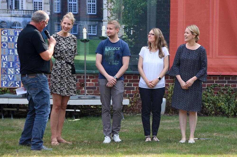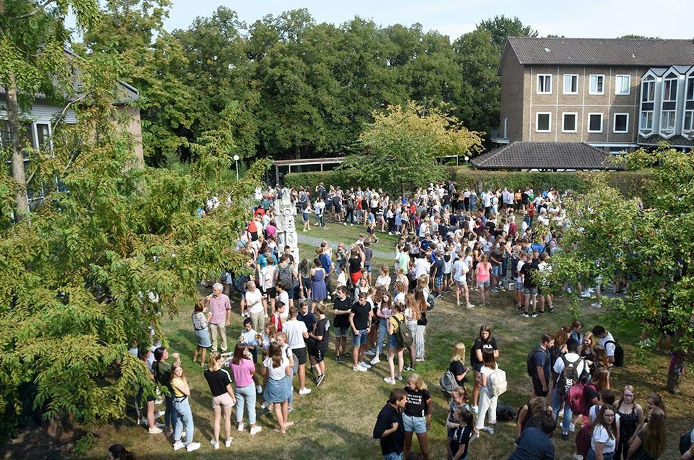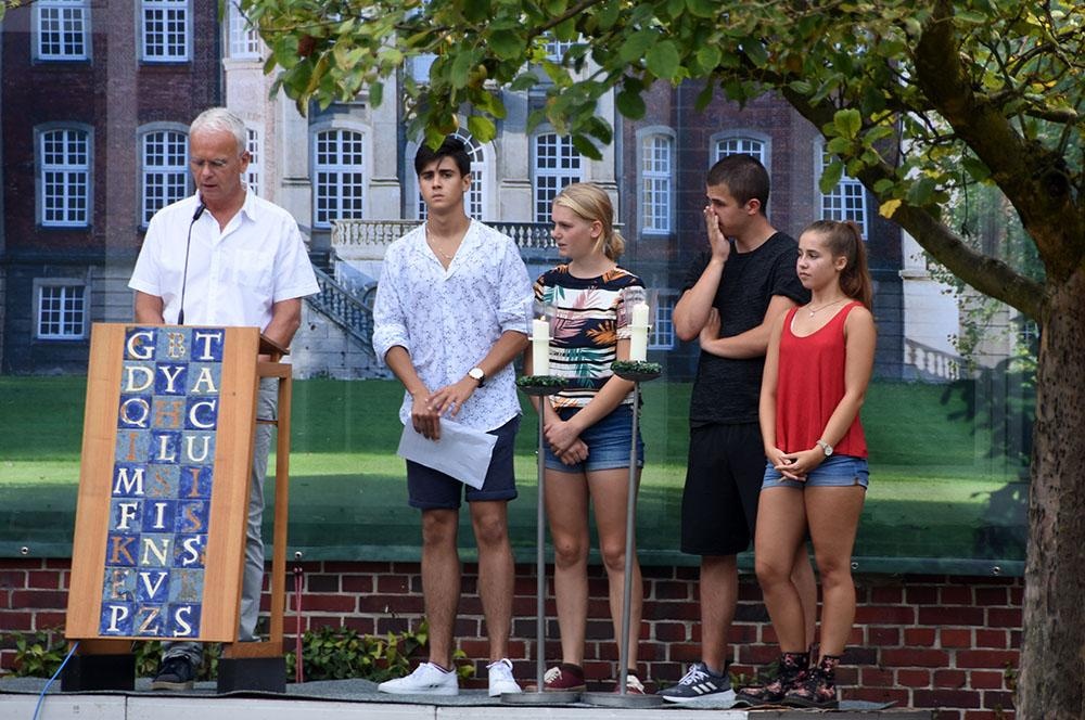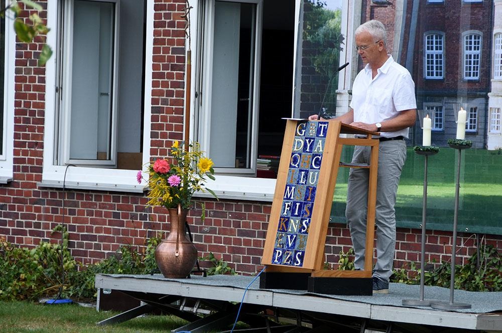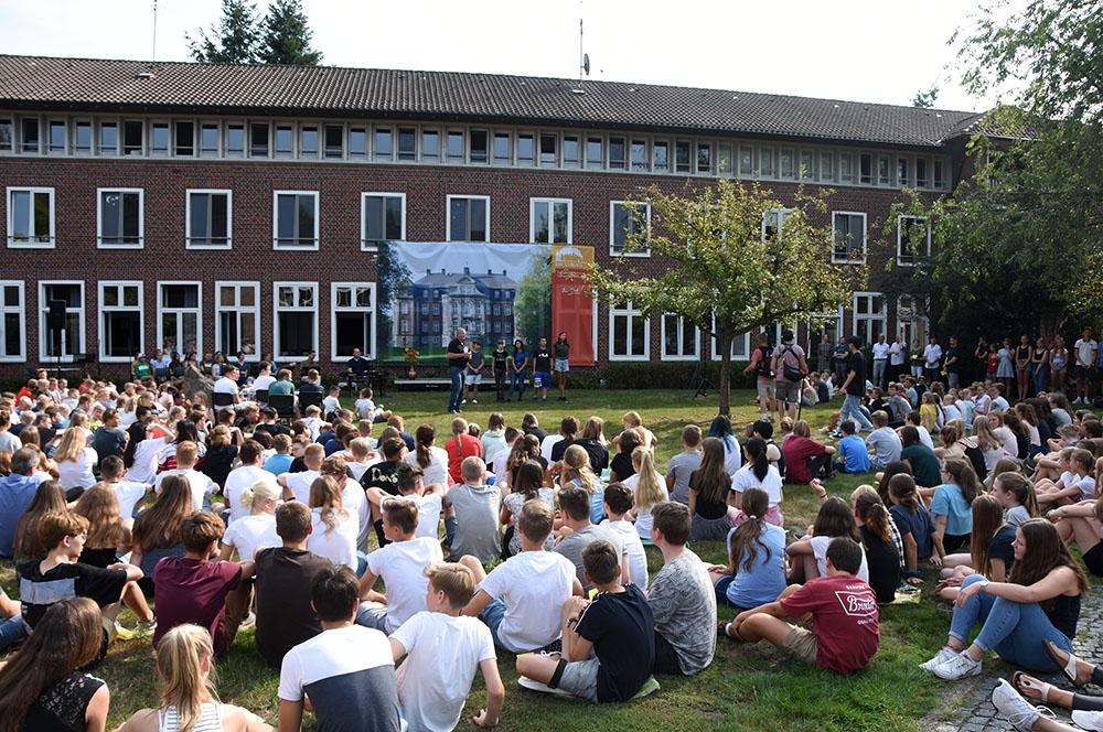 Die Schülerinnen und Schüler der Stufen 6 – Q2 erledigten in den ersten beiden Stunden in Klassenlehrer- bzw. Tutorstunden zunächst eher formale Dinge in den einzelnen Lerngruppen, bevor sie sich in der dritten Stunde im Innenhof trafen, um das Schuljahr gemeinsam mit einem Gottesdienst zu beginnen. Dieser stand ganz im Thema der Gemeinschaft, denn jeder ist wichtig, hat seinen Platz und Freiraum, muss aber auch auf seine Mitschüler schauen. Die Loburg, so bekräftigte Aloys Kleine Büning, will ihren Schülern neben einer guten Schulbildung auch eine gutes Gemeinschaftsklima und eine vertrauensvolle Lernatmosphäre bieten. Die Schulgemeinschaft sei ein bisschen wie Familie, man verbringe viel Zeit miteinander und sei darauf angewiesen, dass man gemeinsam die Herausforderungen eines neuen Schuljahres in Angriff nehme. Aufmerksamkeit, Verbundenheit, ein fester Halt, Teamgeist und Freiraum seien für das Gelingen unabdingbar.