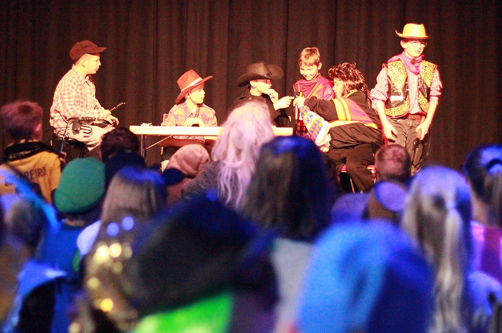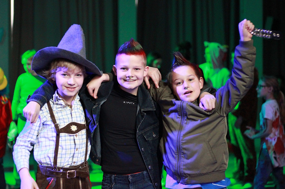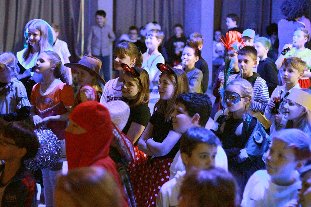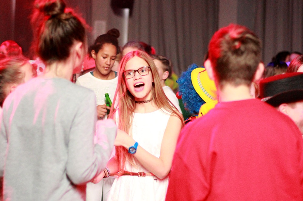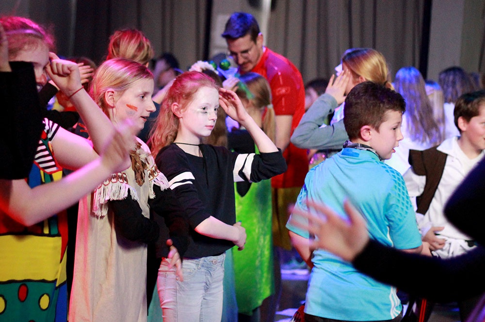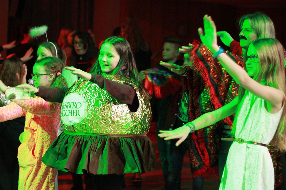 Wer am Donnerstag in den Nachmittagsstunden in die Aula schaute, der staunte nicht schlecht: Es tanzten nicht nur Bären, Einhörner und Mitglieder der Sesamstraße, nein, auch Indianer, Cowboys und allerlei Ganoven, Hexen, Omas und Opas, sowie Hippies hatten sich dort auf Einladung der Klassenpaten eingefunden. Der Fantasie waren keine Grenzen gesetzt. Um die Stimmung anzuheizen, hatten die sechsten Klassen verschiedene Musikbeiträge, Tänze und Spiele vorbereitet, die während der Party präsentiert wurden. Die Klassenpaten führten durch das Programm und immer wieder wurden die zuschauenden Schülerinnen und Schüler motiviert, bei Animationstänzen mitzumachen und sich den Polonaisen anzuschließen. Es herrschte eine tolle und ausgelassene Stimmung. Die Spannung stieg noch weiter, als es darum ging, wer das tollste Kostüm hat. Die Verkleidungen, die den Paten als besonders originell aufgefallen waren, wurden den Mitschülern präsentiert.