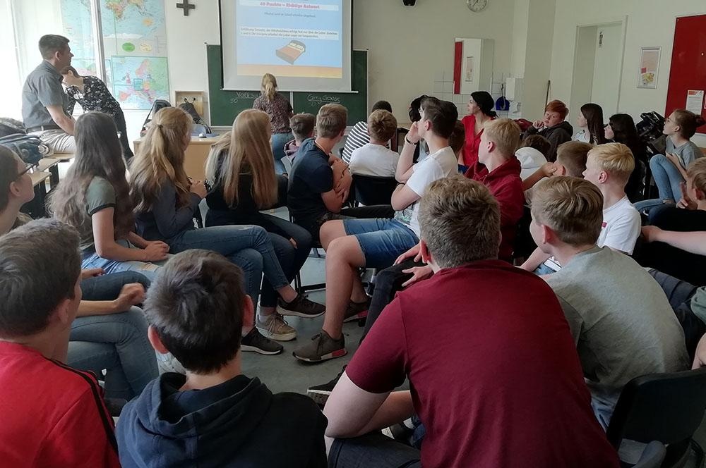 Thematisch vervollständigt wurde die Themenwoche durch das schulinterne Medienscout-Angebot „Always on!?“ . Dies richtete sich ebenfalls an die 8. Klassen und warf die Frage auf, inwieweit der Umgang mit Smartphone und Internet in eine Mediensucht oder digitale Abhängigkeit führen kann. Gemeinsam mit den Beratungslehrinnen Frau Ahmann und Frau Winter sowie mit Herrn Lülf nahmen die Schülerinnen und Schüler selbstkritisch das eigene Medienverhalten in den Blick. Anschließend erarbeiteten die einzelnen Klasse einen möglichen „Weg in die Sucht“, diskutierten, welche beliebten Apps und Internetangebote ein entsprechendes Suchtpotential haben und berieten über Hilfen und Lösungen für den Fall einer drohenden Abhängigkeit.