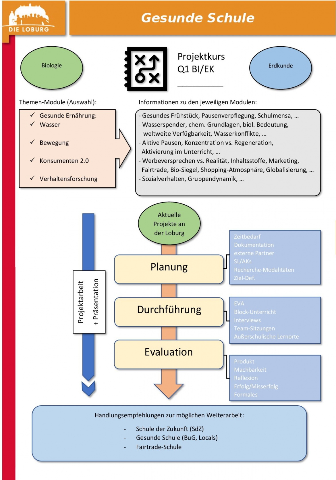 Die Schüler*innen sollen im Rahmen des Projektunterrichts ihren schulischen Alltag auf gesundheitsförderliche Aspekte hin untersuchen und im Rahmen ihrer Projektgruppen Lösungsstrategien entwickeln und authentische Ziele und Produkte umsetzen. Dabei sollen sie mit internen und/oder externen Kooperationspartnern ihre Projektpläne abstimmen und umsetzen. Eine Evaluation ihrer Projekte schließt das jeweilige Gesundheitsprojekt ab.
