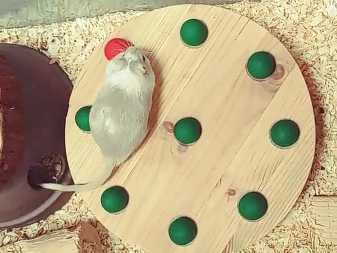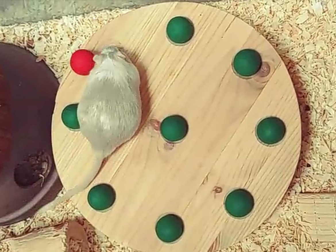 Die Maus hat gelernt, dass sich nur unter der roten Kugel eine Futterbelohnung befindet, unabhängig davon, an welcher Position sich die Kugel befindet.