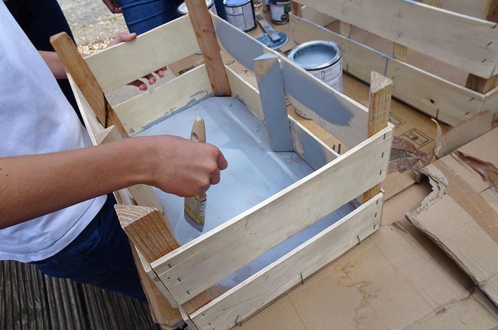Obstkisten sind der Ausgangspunkt für ein persönliches Möbelstück und finden somit eine zweite Verwendung. Je nach Geschmack wird das Möbelstück in der Lieblingsfarbe lackiert und nach Wünschen aufgeteilt. Details wie Rollen machen aus der Holzkiste ein persönliches Regal oder einen Nachttisch.