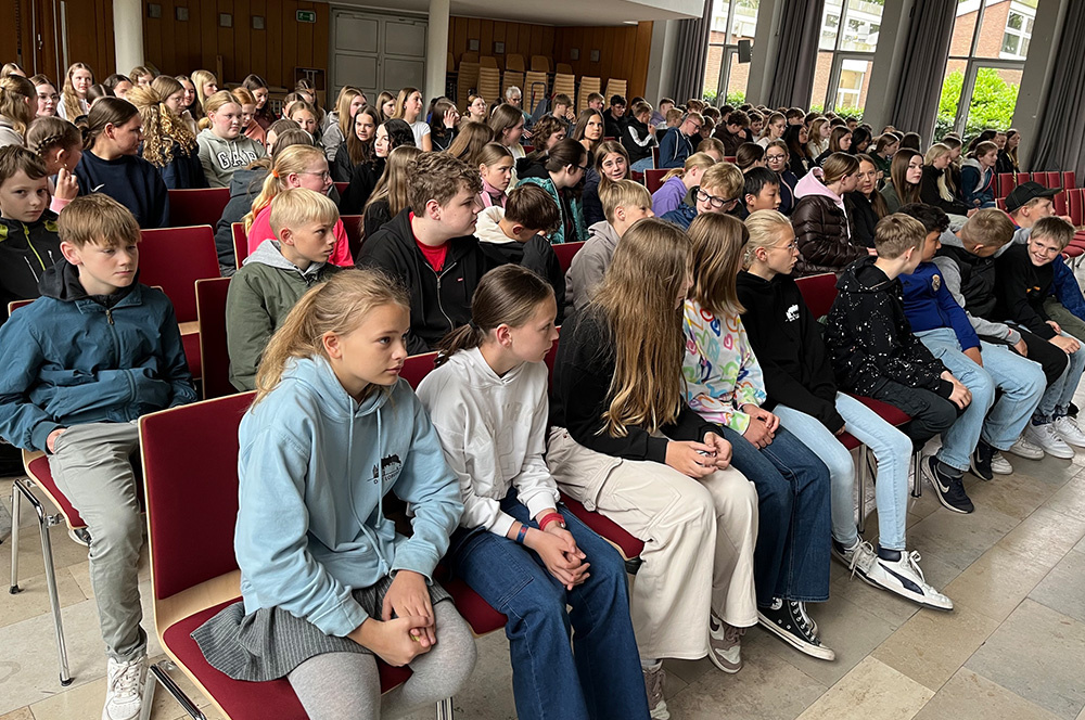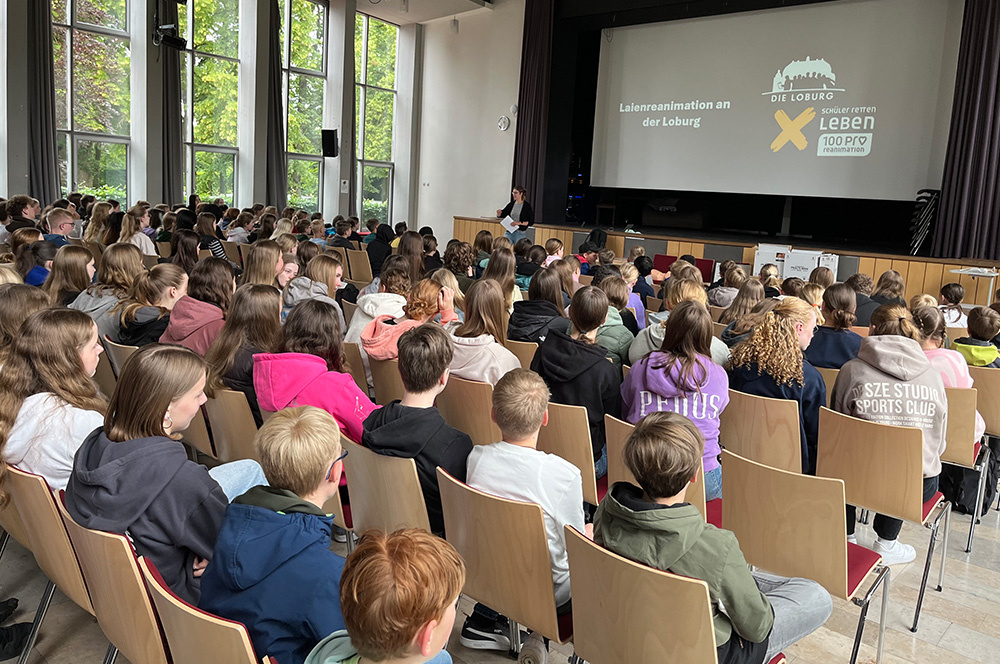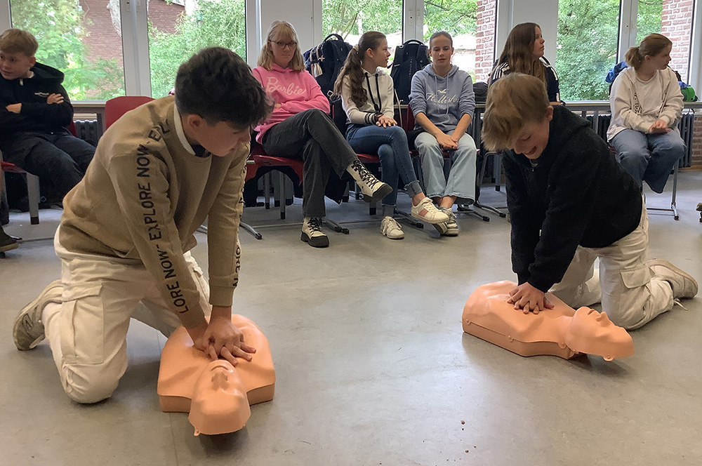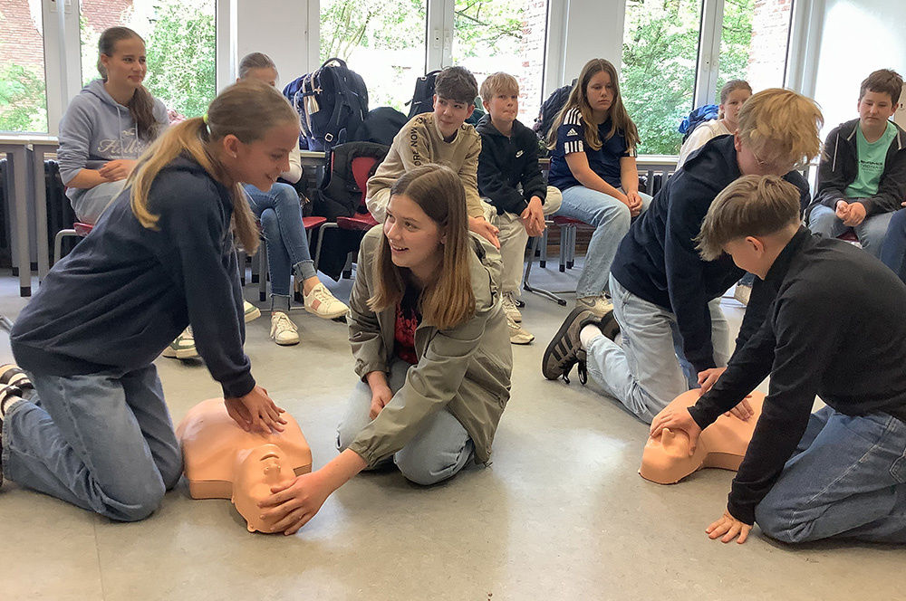 Diese Wiederbelebungskompetenz lernten die Loburger, indem sie in ihren Jahrgangstufen einen Einstiegsvortrag in der Aula über die Hintergründe der Reanimation hörten. Nach der Theorie übten die Schülerinnen und Schüler in ihren Klassen den lebensrettenden Dreischritt an Reanimationspuppen: Bewusstsein und Atmung PRÜFEN, Hilfe RUFEN und die Herzdruckmassage beginnen: DRÜCKEN. Während der Übungsphasen wurden die einzelnen Klassen durch engagierte Schülerinnen und Schüler des Schulsanitätsdientes unterstützt, die die Schülerinnen und Schüler anleiteten und als Expert*innen auf die korrekte Durchführung achteten.