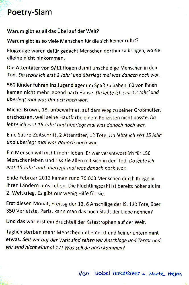 In den darauffolgenden Stunden haben wir Schülerinnen und Schüler der evangelischen Religionskurse der EF versucht, eben dies zu tun. Wir haben uns erzählt, wie es uns erging, als wir erfuhren, was in Paris geschehen ist und was wir empfinden, wenn wir an die vielen Opfer denken. Wir haben überlegt und diskutiert, ob die Terroranschläge in Paris und an vielen anderen Orten in der Welt Auswirkungen auf unser eigenes Leben hier in Deutschland haben und was nun als nächstes geschehen könnte. Können wir so weitermachen wie bisher, oder müssen wir nun in Furcht vor Terroristen leben?