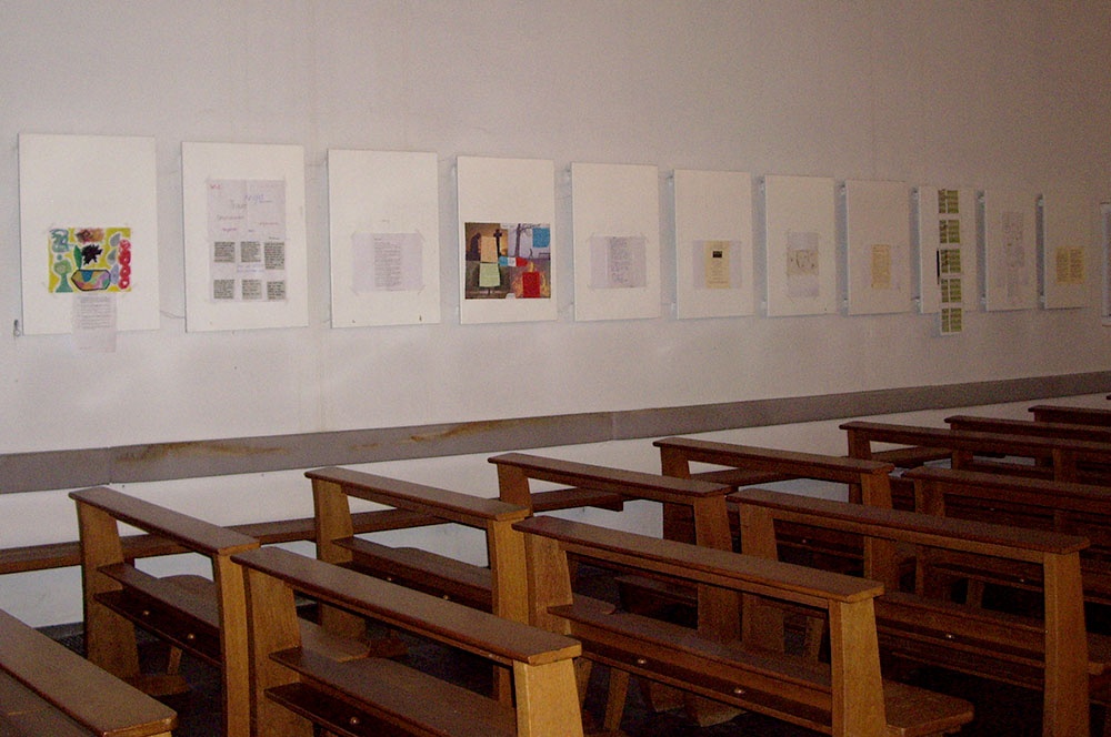 Mit einer kleinen Ausstellung unserer Werke in der Kirche wollen wir unsere Gedanken mit jedem, der sich die Zeit nehmen möchte, teilen. Dazu haben wir gemeinsam mit Frau Fromme und Herrn Rensinghoff beschlossen, mit den Ergebnissen die Darstellungen des Kreuzweges in unserer Kirche zu überkleben. Wir haben die Kirche jedoch nicht ihres Passionsweges beraubt: Nach wie vor kann man dort eine Abfolge von Bildern betrachten, die von Angst, Schrecken und Schmerz erzählt. Aber wo normalerweise der Leidensweg Jesu Christi zu sehen war, sieht man nun einen Leidensweg 2015.