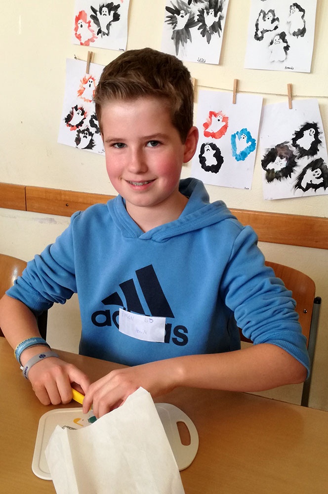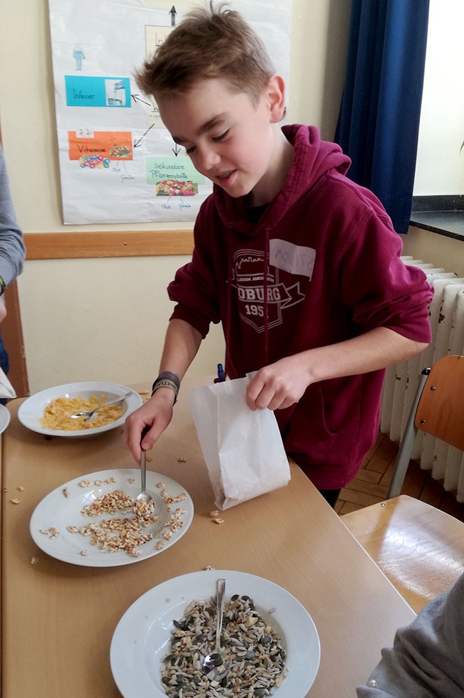 Nach dem 1. Workshop gab es zum Mittagessen in einem Workshop entstandene super-leckere und gesunde Wraps. Danach fing die zweite Workshop Phase an, wo es um „Essen für den Rest der Welt“ ging. Wir untersuchten, wo eigentlich das Obst herkommt, das wir im Supermarkt kaufen können. Dort haben wir gelernt, dass man am besten Obst aus der Region kaufen sollte, da man so die Verschmutzung der Erde nicht weiter voran treibt, weil das Obst aus zum Beispiel Neuseeland erst mit (meistens) durch Schweröl angetriebene Schiffe nach Europa transportiert werden muss. Außerdem haben wir dort mit Bio-Zutaten ein eigenes, leckeres Müsli zusammen gemixt, und viele von uns haben dabei zum ersten Mal Haferflocken selbst hergestellt.
