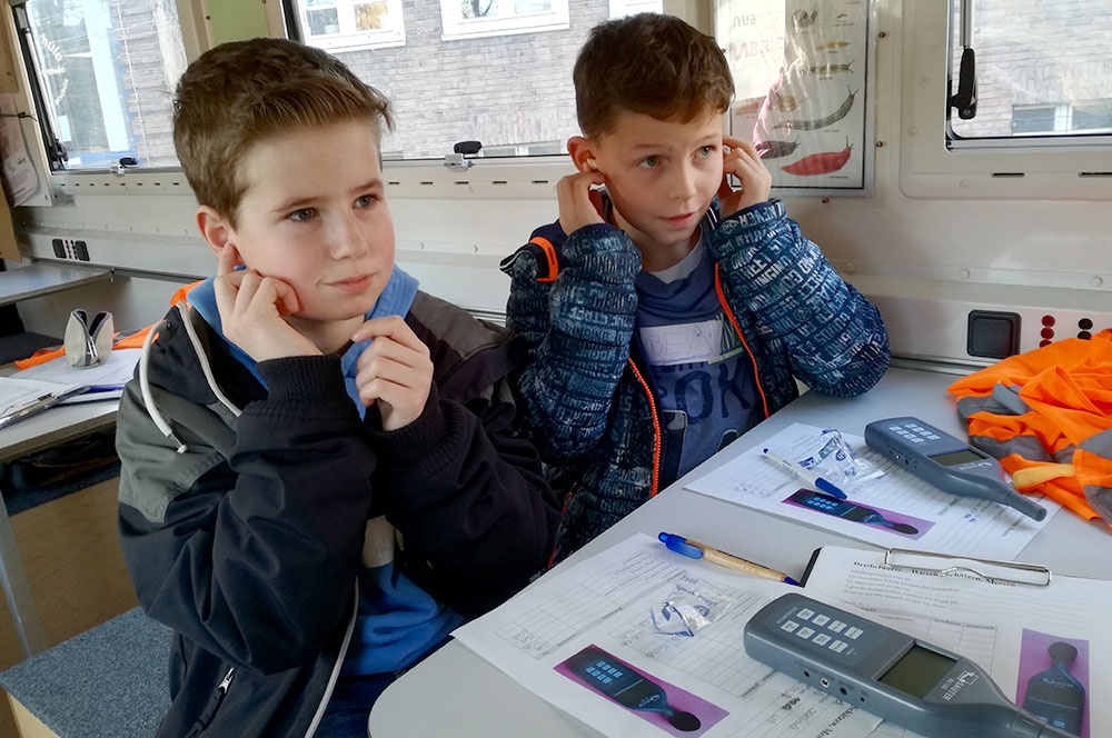 Einer der Workshops fand im Lumbricus, dem Umweltbus, statt und er war über Lautstärke im Alltag. Es ging in dem Workshop darum, dass uns klar wird, wie laut es im Alltag ist. Wir haben dort gelernt wie leise 0 db (Dezibel) sind und ab welcher Lautstärke Lärm schädlich für den menschlichen Körper werden kann. Überraschend war, dass selbst für uns normal laute Unterhaltungen, schon über diesem Grenzwert (80db) liegen können. In eigenen Messungen haben wir dann als Lärmdetektive unterschiedlichste Geräusche aus der Umgebung untersucht, wie z.B. Laubsauger, vorbeifahrende Autos, Musik aus den Kopfhörern unserer Handys oder eine Schülergruppe in der Sporthalle.