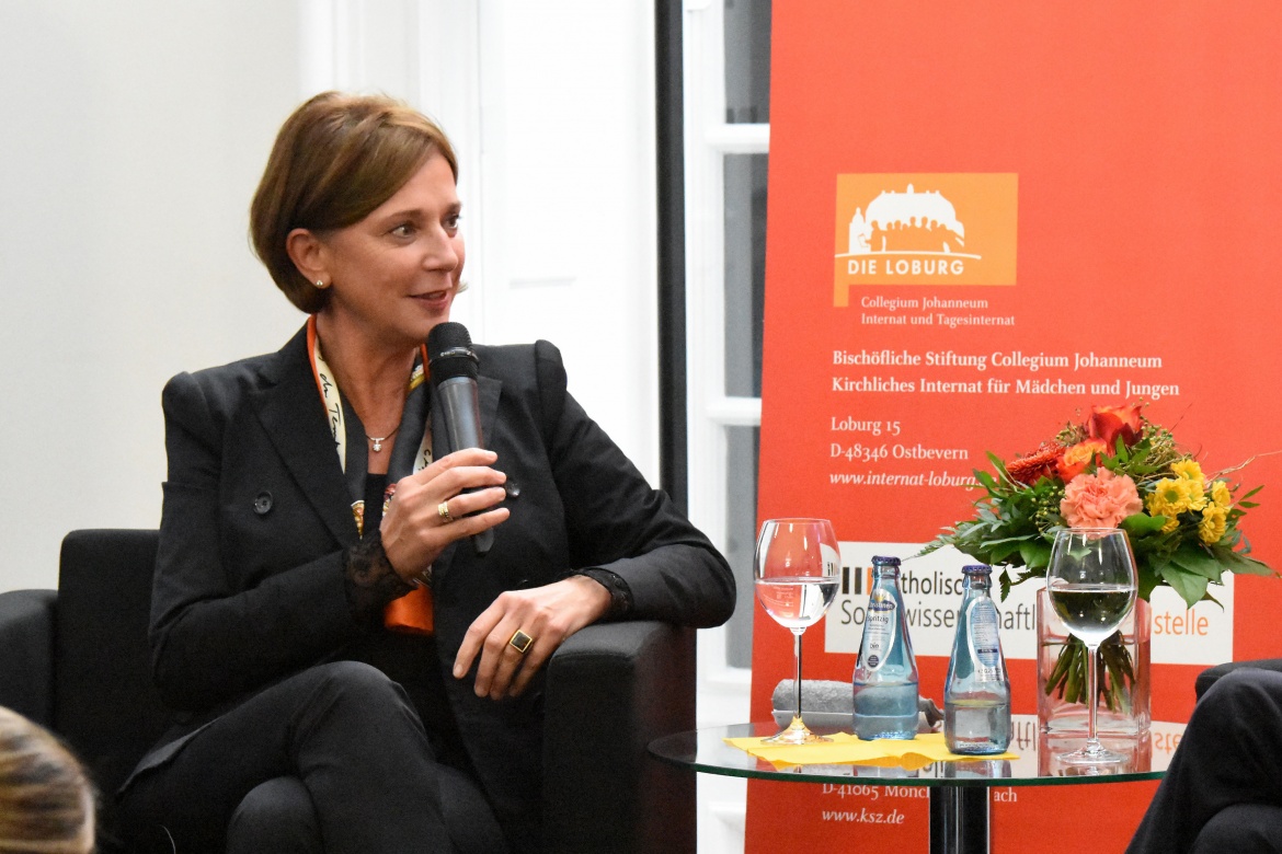 Es war ein besonderer Tag, den sich NRW-Schulministerin Yvonne Gebauer für ihren Besuch auf der Loburg ausgesucht hatte. Am frühen Nachmittag hatte die FDP-Politikerin in Düsseldorf die Rückkehr zum Abitur nach neun Gymnasialjahren erklärt, am Abend stand sie Rede und Antwort beim Loburger Schlossgespräch. Im vollbesetzten Saal – darunter viele Schulleiter aus der Region – sprach sie mit Moderator Dr. William Middendorf, Leiter der Hauptabteilung "Schule und Erziehung" im Bistum Münster, über Lernen im digitalen Wandel, Talentschulen – und natürlich den Ausstieg aus dem "Turbo"-Abitur.