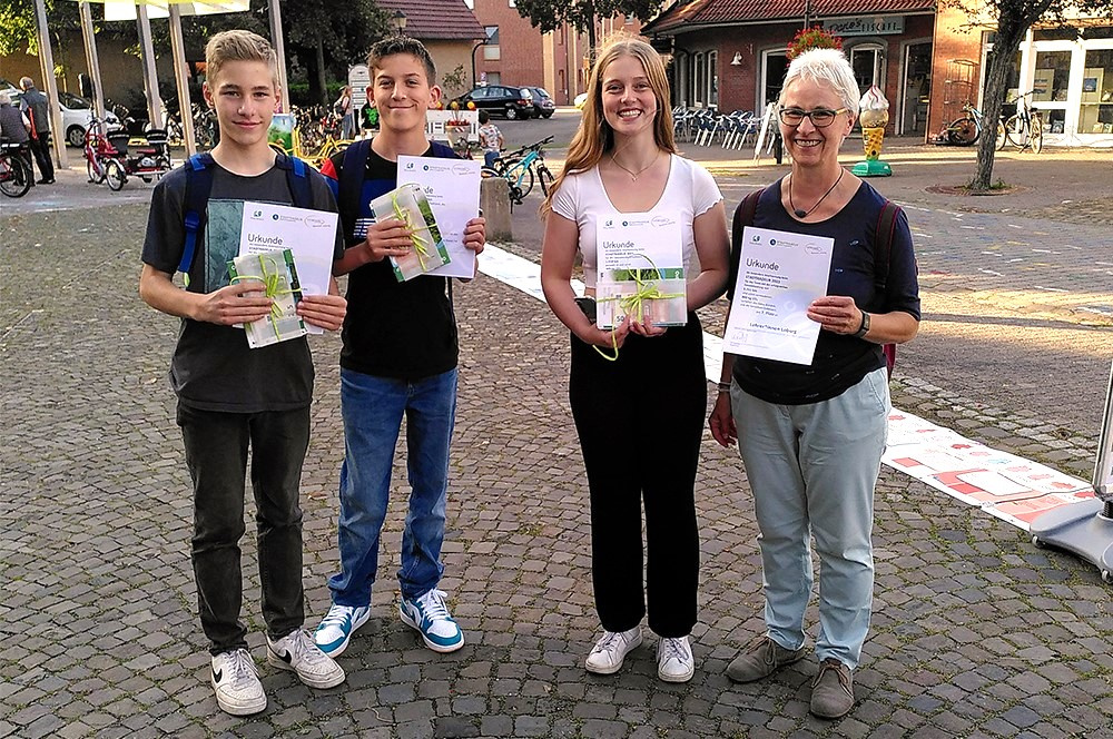 Die jetzige Klasse 8a, die Chemiekurse der Q2 und die Klasse 10d wurden am Mittwoch im Rahmen der Siegerehrung für das Stadtradeln geehrt. Vom 20. Mai bis 9. Juni sind die Schüler:innen besonders viel Fahrrad gefahren und haben zusammen 5.947 Kilometer gesammelt. Sie wurden für ihr diesjähriges Engagement mit 100,- €, 50,- € und 25,- € für den Gold-, Silber- und Bronze-Platz unter den Schulklassen geehrt. Die Lehrer:innengruppe der Loburg belegte mit 25 Teilnehmer:innen und 5.311 erradelten Kilometern den siebten Platz unter den gesamten Teamwertungen von 28 teilnehmenden Teams. Die Loburg nimmt seit vier Jahren an diesem Wettbewerb teil. Ich freue mich sehr, dass ich immer wieder Schüler:innen und Kolleg:innen für die Teilnahme gewinnen kann. Neben dieser Aktion nimmt die Loburg seit sieben Jahren an der Klimatour des VcD Deutschland teil. Hier werden die Fahrradkilometer von März bis August gesammelt. Diese dienen dazu eine virtuelle Deutschlandtour zu radeln und zusätzlich Abstecher ins europäische Ausland zu machen. Nebenbei erfahren die Teilnehmenden viel über den Klimaschutz und viele spannende Dinge rund ums Fahrrad.