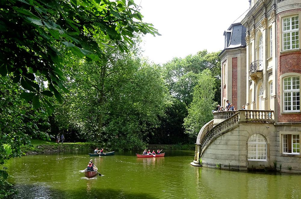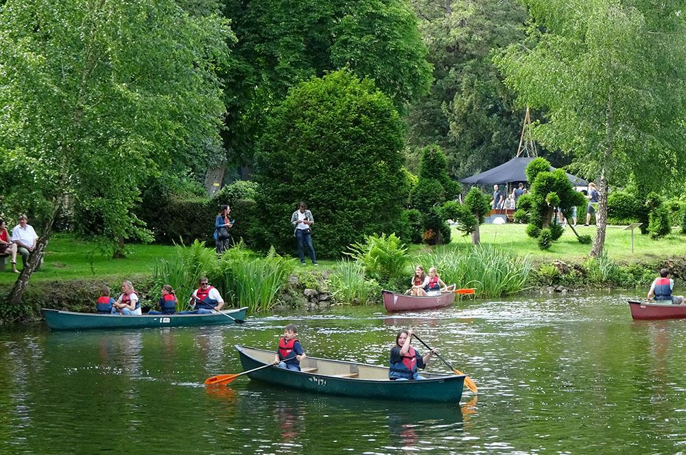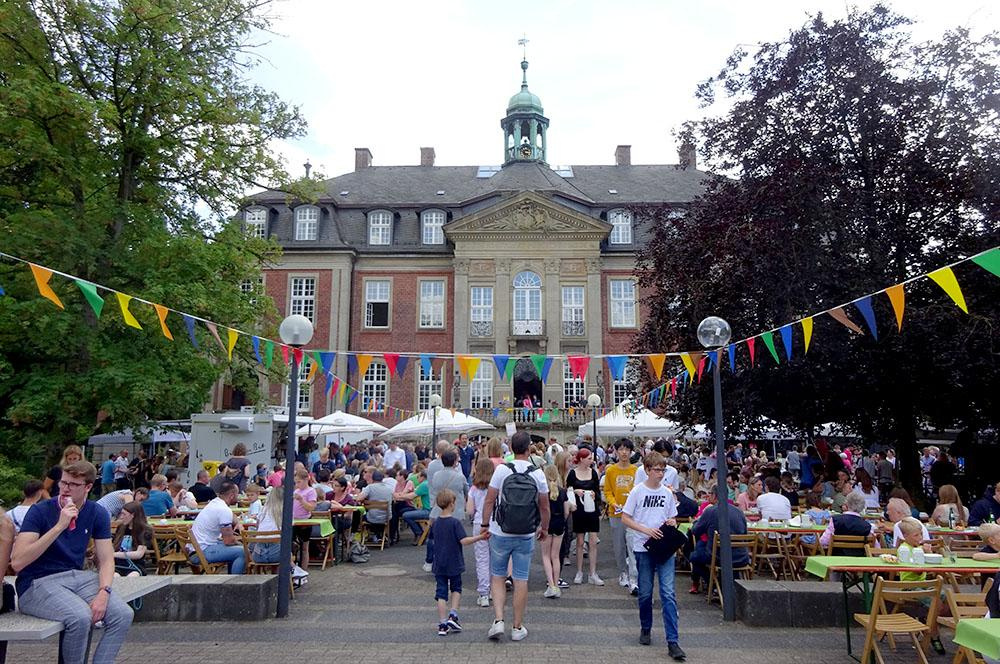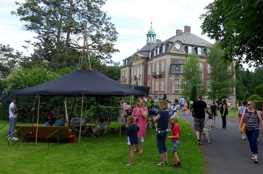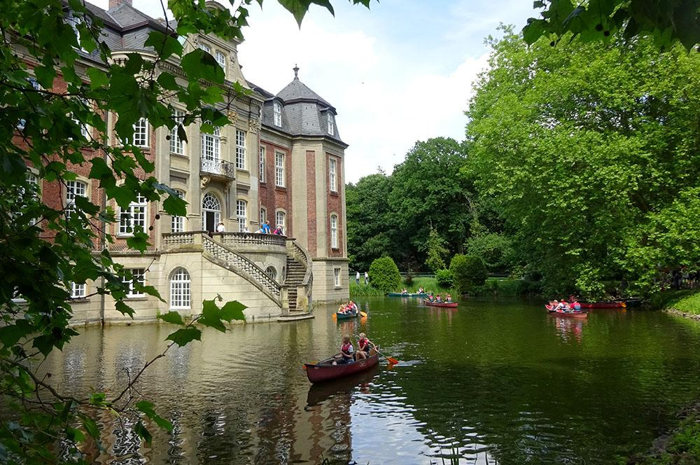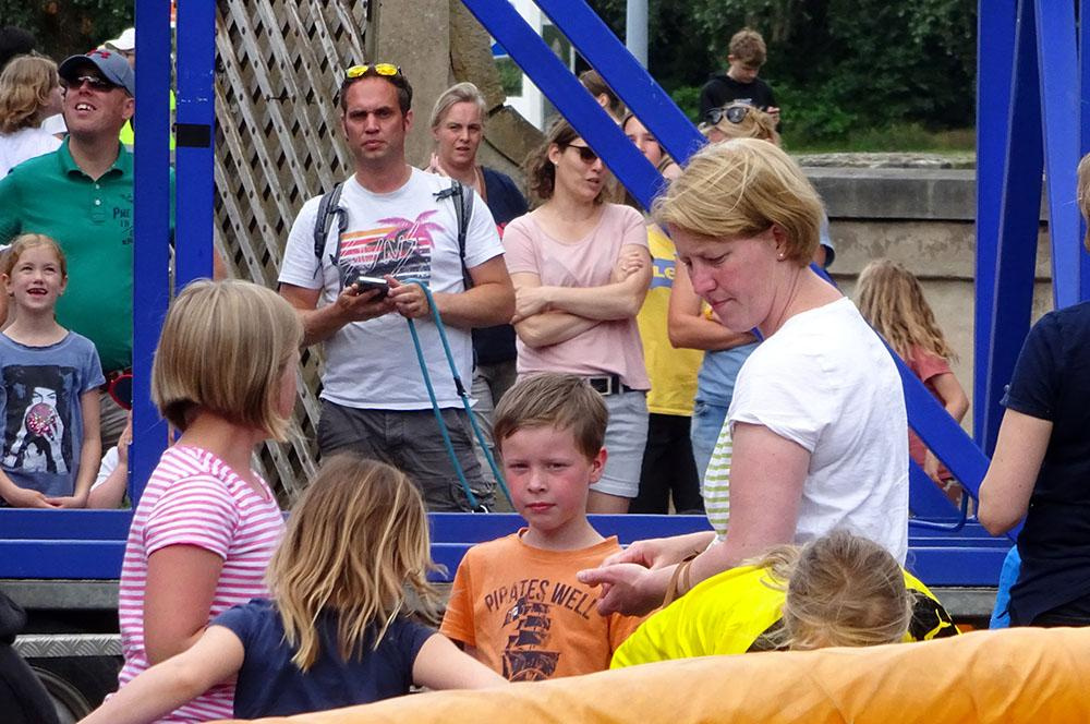 Und mit Schwung ging es für die Gäste weiter über das Festgelände. Rund ums Schloss stachen im Minutentakt Kanus auf der Gräfte in See, auf dem Surf-Simulator bewiesen selbst die Kleinsten Sommersportler ihre Künste und die Looping-Bikes ließen Schloss und Radler Kopf stehen.