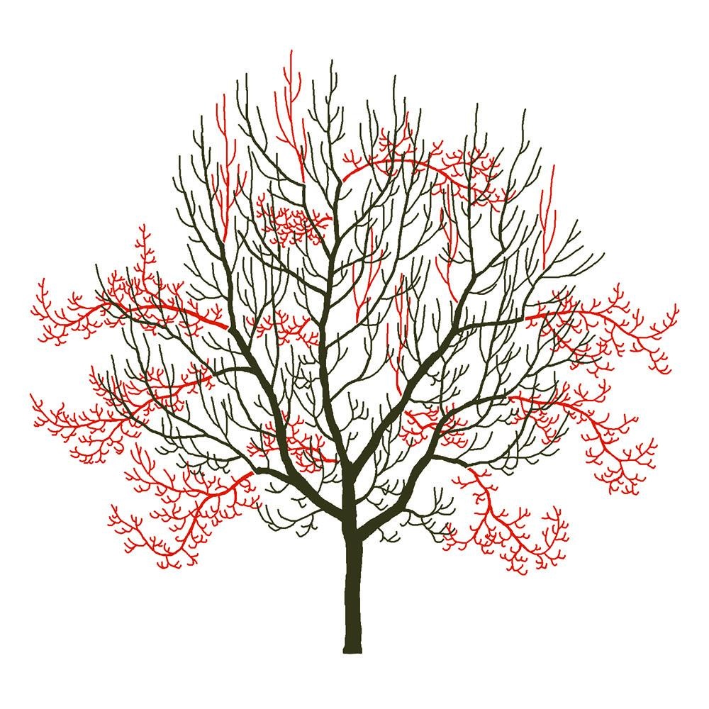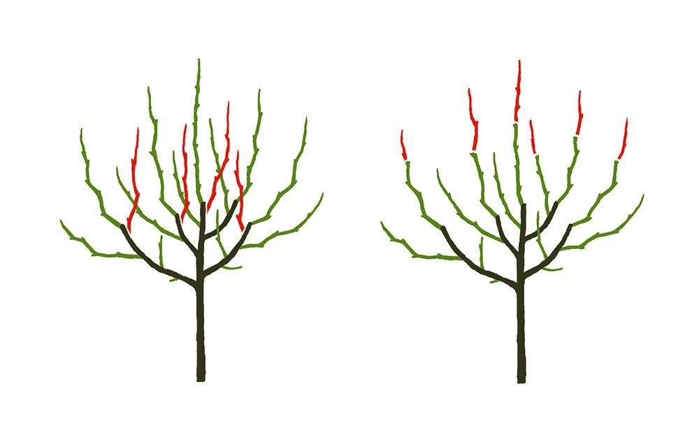 Dieser Überwachungsschnitt sollte bei Äpfeln und Birnen im Winter und bei Pflaumen und Kirschen im Sommer nach der Ernte erfolgen. Ist der jährliche Zuwachs weniger als 20 cm, muss stärker geschnitten werden, um Wachstum anzutreiben.