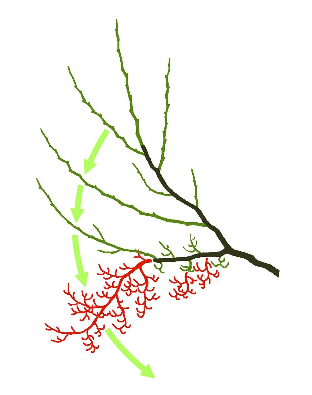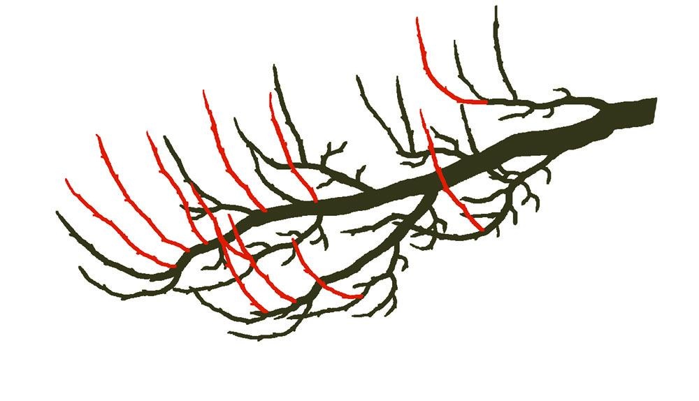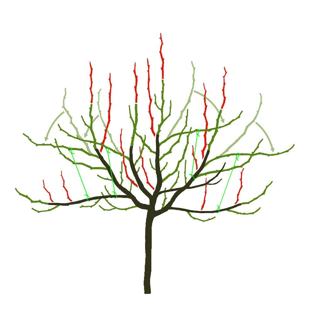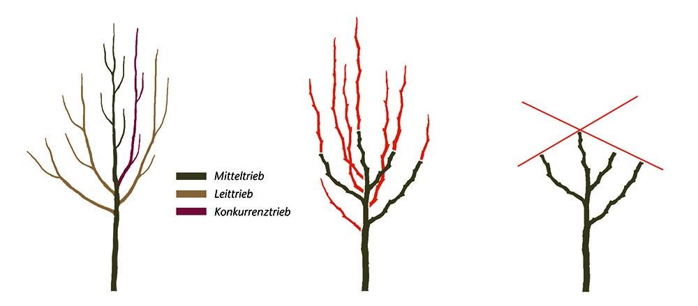 Wichtig: Die Seitentriebe, die sich auf der Oberseite der Leit-Äste gebildet haben, müssen direkt an der Basis entfernt werden. Allerdings können die Seitentriebe, die auf der Unterseite waagerecht und eher schwach sind, als Fruchtholz ungeschnitten stehen bleiben. Stärkere sollten eingekürzt werden. Bei der Stammverlängerung können waagerechte und schwache Triebe verbleiben. Steilstehende Triebe gelten als Konkurrenztrieb und müssen weichen. Triebe, die später das Obst tragen, sollten nicht angeschnitten werden, außer dann, wenn der Baum nicht wächst. (siehe Abb. 10).