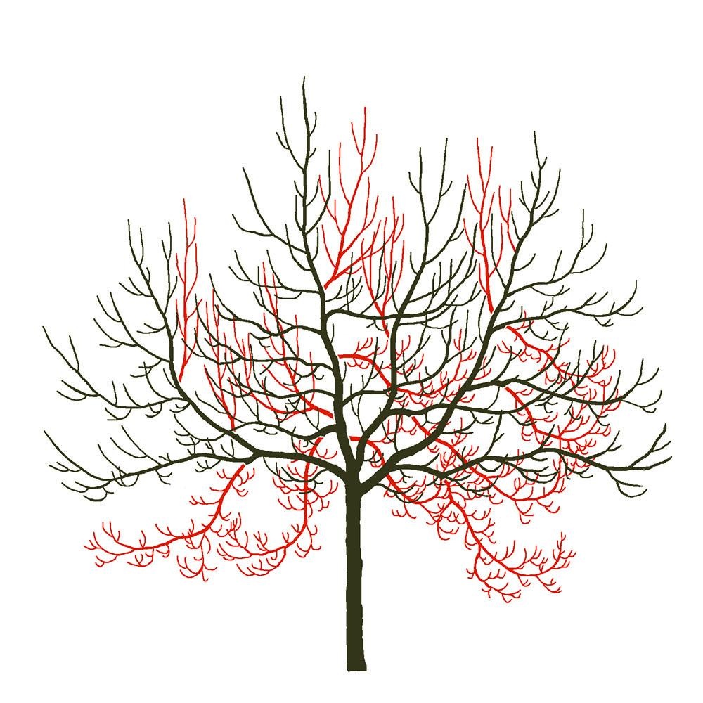 Abgeschlossen ist der Erziehungsschnitt nach 8-10 Jahren (Abb. 5). Der Baum wird dann in Abständen von 3-5 Jahren ausgelichtet. Zu dicht stehende Triebe, die auch noch in die Krone wachsen oder stark nach unten hängen, werden an der Basis entfernt. (Abb. 6). Bei zu steilem Wachstum der Nebentriebe kann durch »Waagerechtstellen« dieser Triebe (Herunterbinden) eine Umstellung von Holztrieb zum Fruchttrieb erreicht werden (Abb. 7).