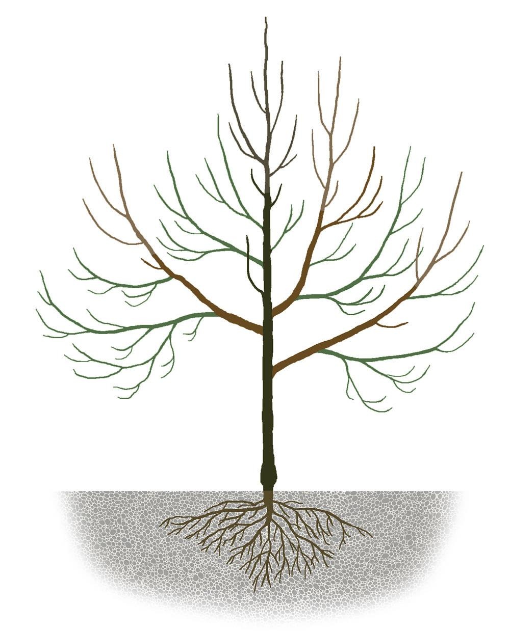 Beim Pflanzschnitt werden die Leit-Äste um etwa ein bis zwei Drittel ihrer Länge eingekürzt. Bei der Auswahl der Leit-Äste ist darauf zu achten, dass sie ca. im 45o-Winkel zum Stamm stehen. Es besteht auch die Möglichkeit, die Äste mit Hölzern nach außen zu biegen oder sie hochzubinden.