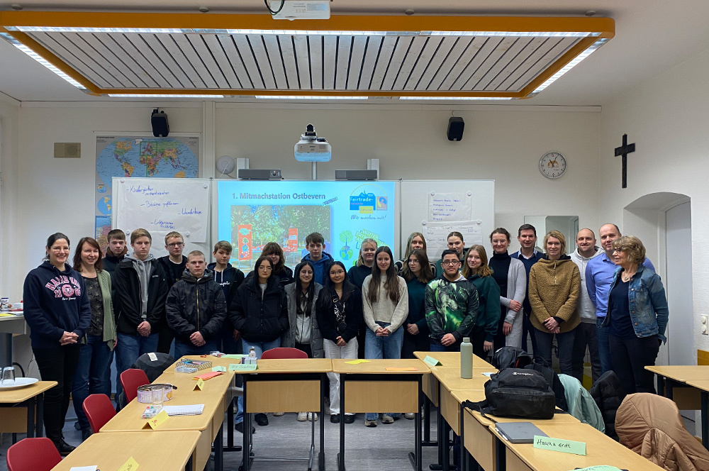 Bei dem Treffen an der Loburg wurde die neue Mitmachstation „Weiter ertragen, was abgetragen wurde?“ weiteren Schüler*innen vorgestellt und über die zukünftige Einbindung in die Aktivitäten der örtlichen Schulen und Vereine diskutiert. Gemeinsam mit Schüler*innen des Projektkurs Gesundheit und Nachhaltigkeit aus der Q1 und Schüler*innen der JGS 9 von der JAS (Josef-Annegarn-Schule) haben die Beteiligten über die Einrichtung eines außerschulischen Lernortes sowie der Gestaltung eines Schaufensters zur Präsentation von Umweltprojekten diskutiert. Des weiteren wurde mit den Teilnehmer*innen die Fairtrade-Jahresplanung 2024 besprochen, die auch für unsere Schule zusätzliche Anknüpfungspunkte für schulische Projekte bietet. Bereits jetzt setzt die Loburg auf viele Produkte mit dem Fairtrade-Logo: Kaffee, Schokolade und auch Rosen tragen an unserer Schule bereits das weltbekannte Label.