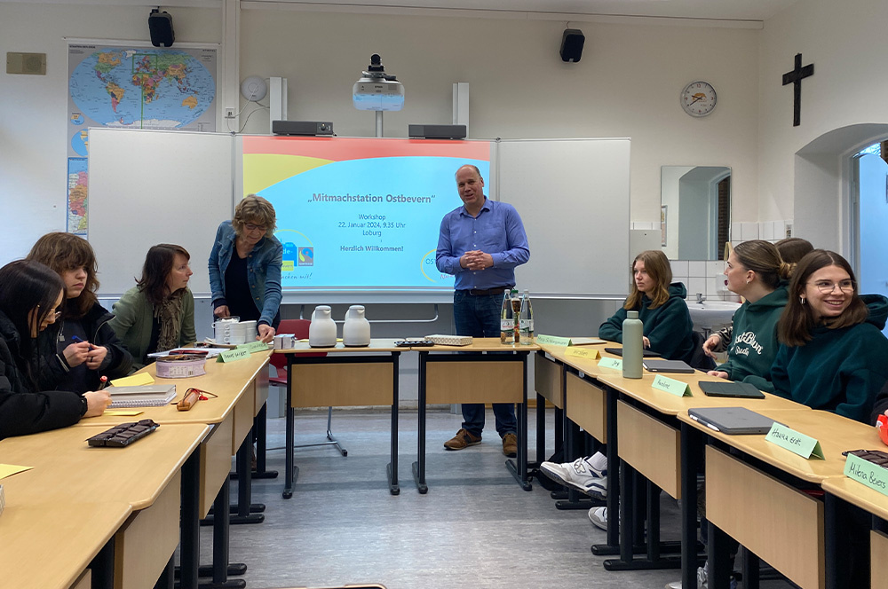 Am 22.01.2024 tagte die Steuerungsgruppe Ostbevern fair & nachhaltig zum ersten Mal an der Loburg. Ziel dieser Veranstaltung war es, Anregungen und kreative Ideen von Schüler*innen der Loburg und der Josef-Annegarn-Schule für die neuen Mitmachstation „Weiter ertragen, was abgetragen wird?“ an der Bever zu erhalten.