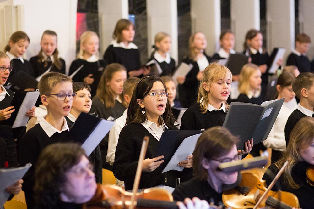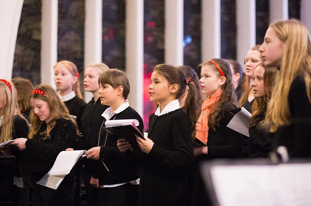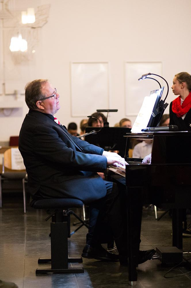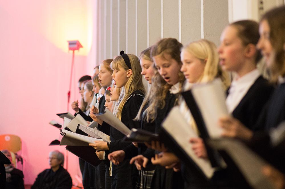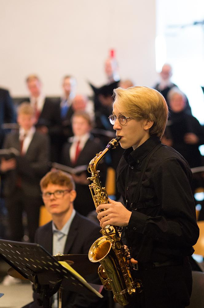 Ein abwechslungsreiches Programm mit viel Sangesfreude boten die Unterstufenchöre der Jahrgänge 5 und 6, darunter zwei Lieder aus der Feder von Matthias Hellmons: Sage, wo ist Bethlehem wurde von ihm im Advent 2016 zu einem Text von R. O. Wiemer komponiert. Zu Ein Licht wurde hell schrieb er Musik und Text bereits 1977 als Abiturient. Begleitet wurden sie von Christina Fietz (Bass), Jan- Dirk Frönd (Gitarre) sowie Henri Fahrentholz (Saxophon) und Tomke Goes (Percussion).
