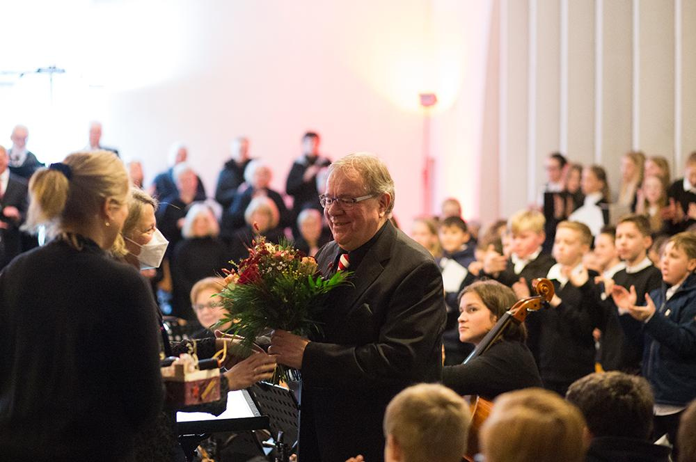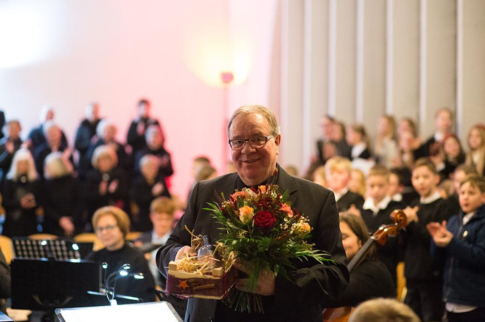 Bevor zum Finale alle mitwirkenden Ensembles stimmgewaltig Joy to the world und Tollite hostias sangen, dankten die Fachschaft Musik, die Schulleiterin Anja Stiglic und das Seelsorgeteam Matthias Hellmons ganz herzlich für die vielen Jahre, die er mit großem Einsatz die Adventskonzerte geprägt und gestaltet hat. Denn dieses Jubiläumskonzert war auch sein letztes Adventskonzert als Lehrer der Loburg. Herzlichen Dank!