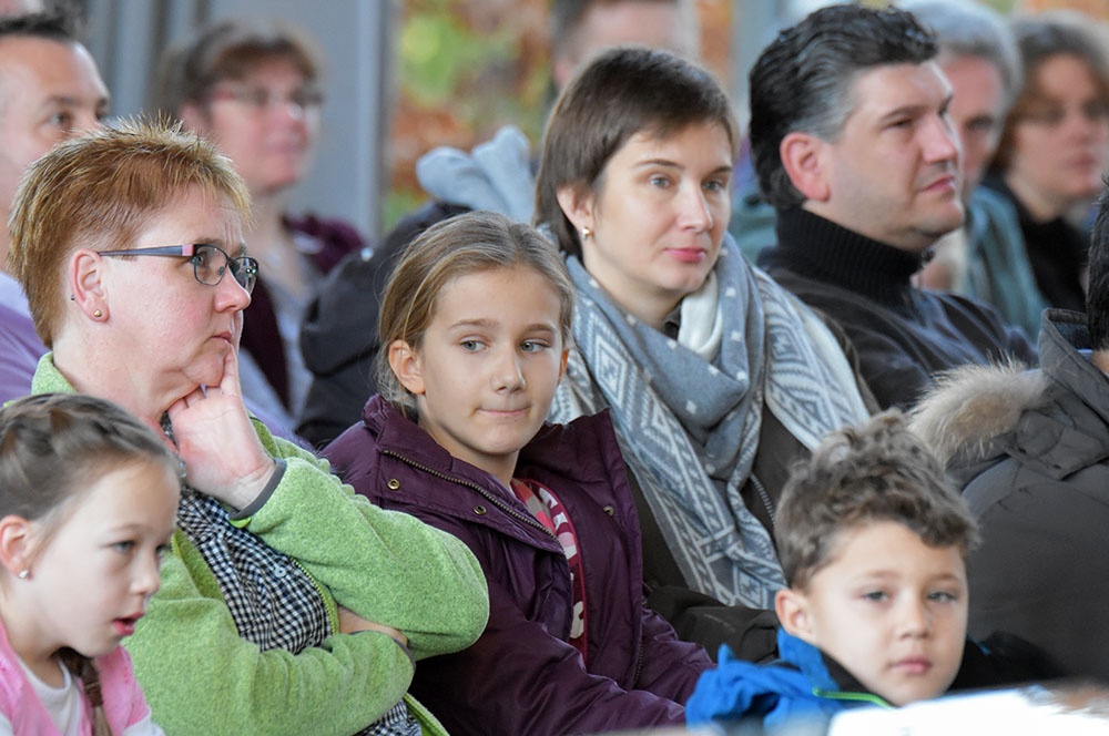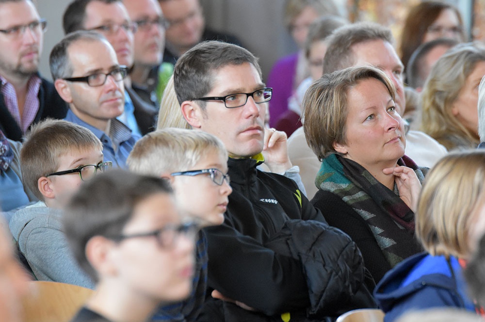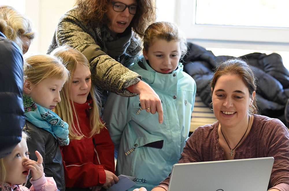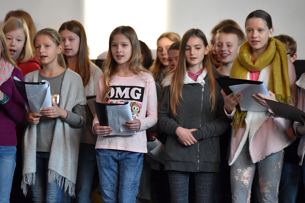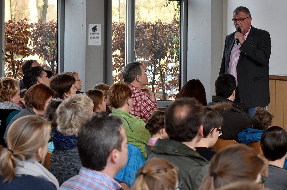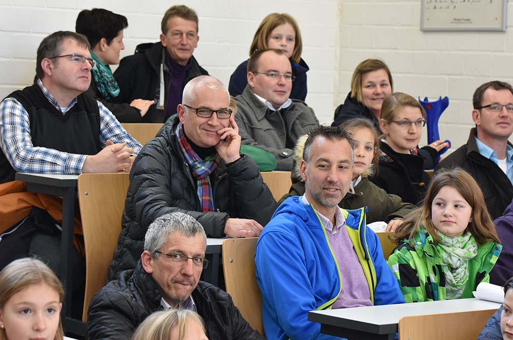 Nach der Begrüßung, die tatkräftig durch eine Chorauswahl der Klasse 6 unterstützt wurde, begann ein kompakter Informationsblock in der gut gefüllten Aula, indem Herr Bertels Einblicke in Ausrichtung der Schule, in Unterricht und Schulleben, Ausstattung, Förderkonzepte, Sprach-, MINT- und Musikaktivitäten gab. Als erste Orientierung konnten die interessierten Schülerinnen und Schüler mit ihren Eltern an Führungen übers Gelände teilnehmen, wobei ihnen Lehrerinnen und Lehrer gerne Rede und Antwort standen.