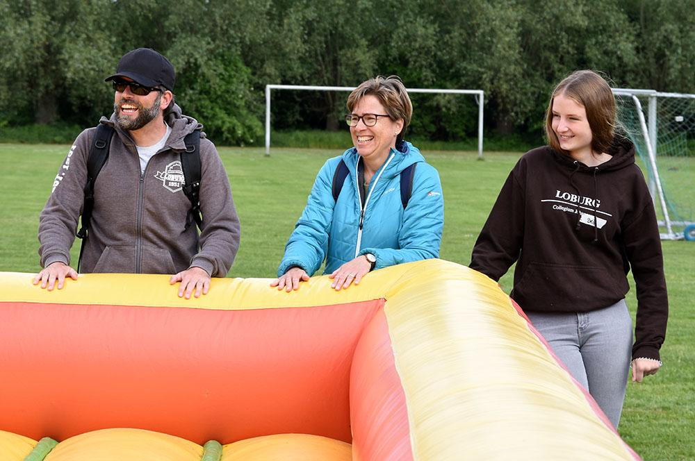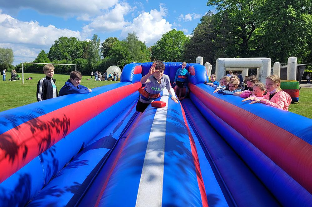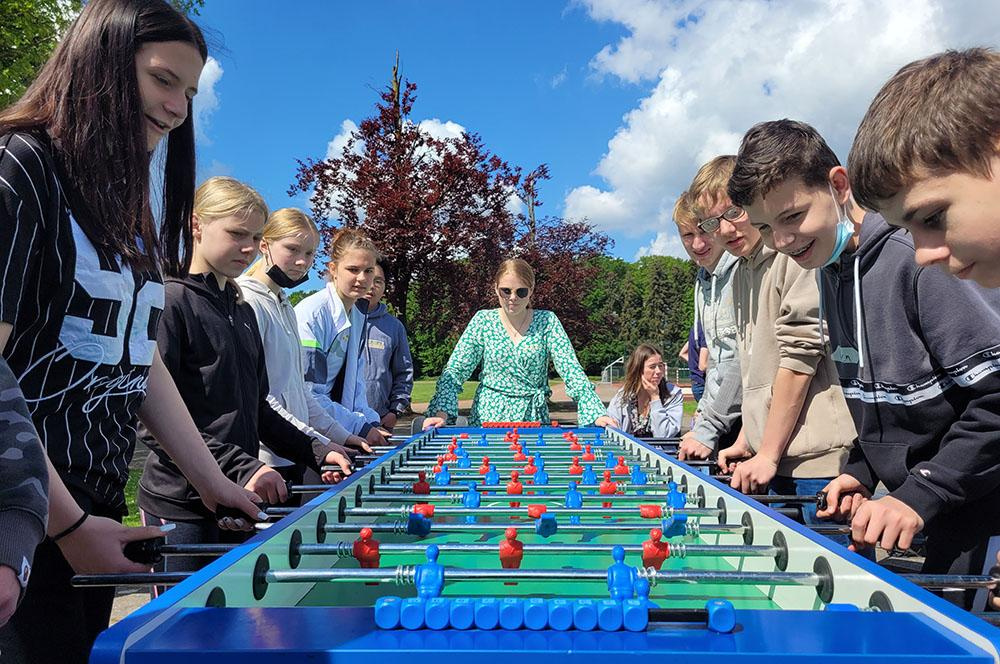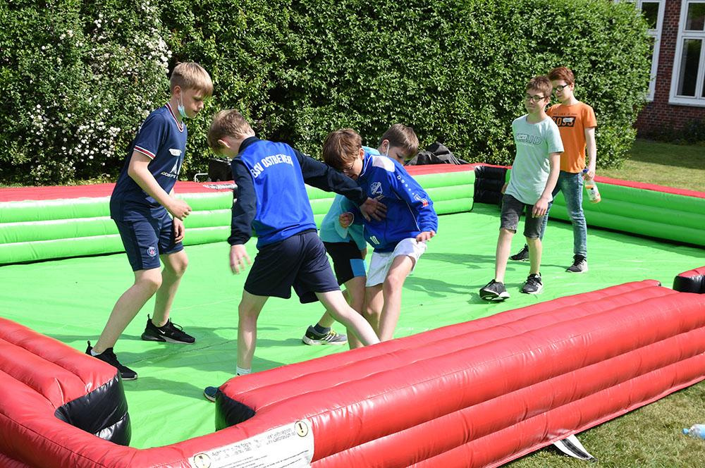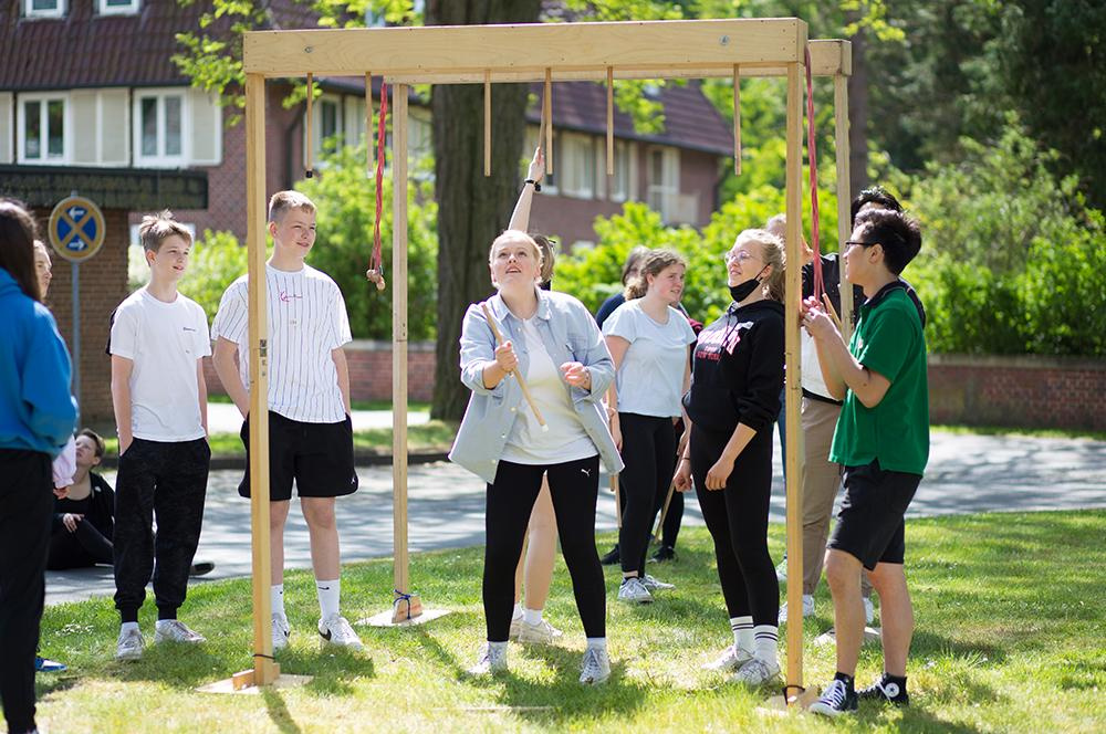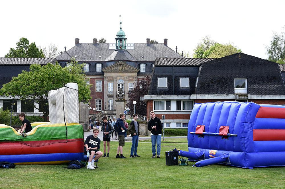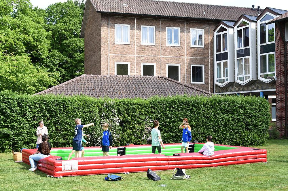 Das erklärte Ziel des Teamtages, der von der Schülervertretung angeregt und maßgeblich organisiert worden war, bestand darin, nach mehr als zwei Jahren mit Corona den Teamgeist der Schüler*innen zu stärken. Um dies zu erreichen, traten die Teams, die zwischen 16 und 20 Spieler*innen umfassten, an den verschiedenen Stationen gegeneinander an. Dabei ging es aber nicht primär darum, unbedingt als Sieger hervorgehen zu wollen, sondern darum, sich gemeinsam den jeweiligen Herausforderungen zu stellen. Zu den Attraktionen gehörten sowohl weitverbreitete Spiele wie „Vier gewinnt“, „Hau den Lukas“ oder Tischkicker, die hier allerdings in Großformat zum Einsatz kamen, als auch eher unbekannte Spiele wie etwa der „Sorbing Ball Run“, bei dem die Herausforderung darin besteht, in einem aufblasbaren transparenten Ball einen Rundkurs zu durchlaufen.