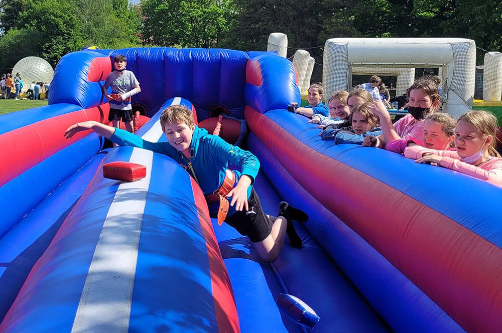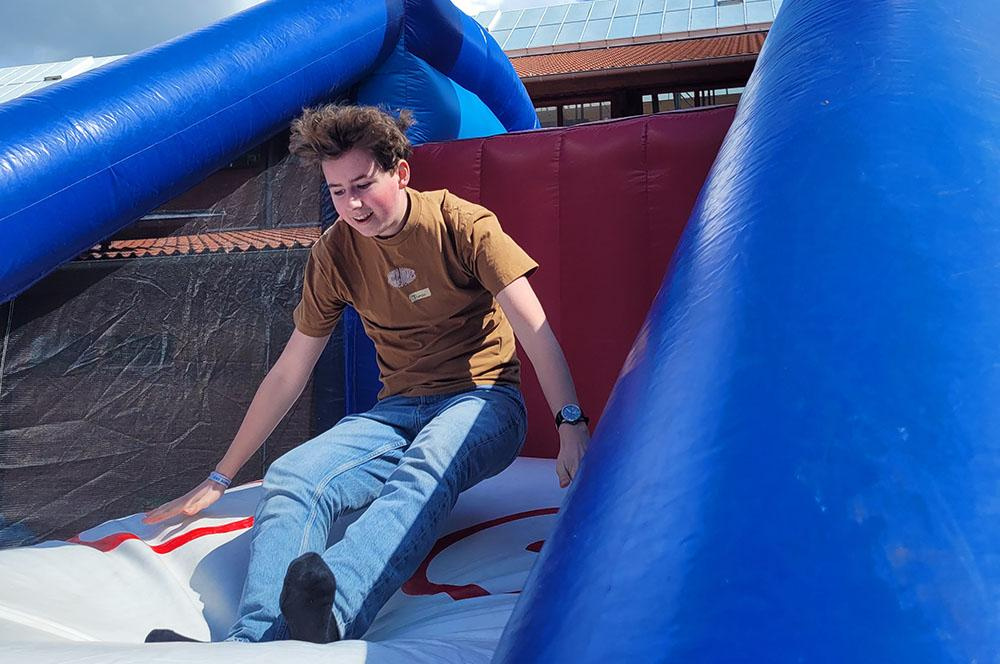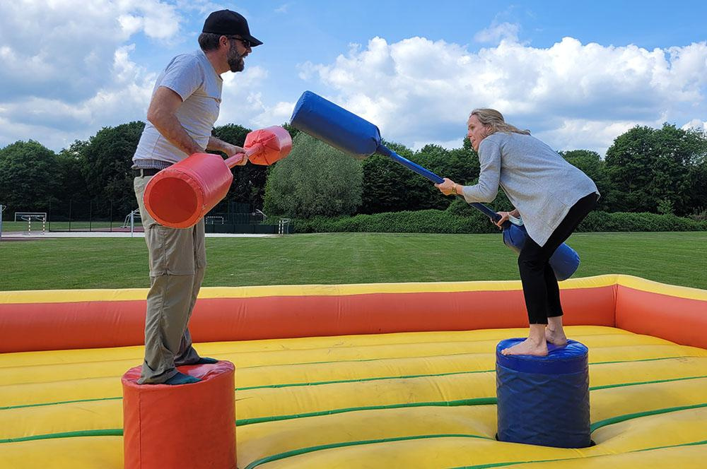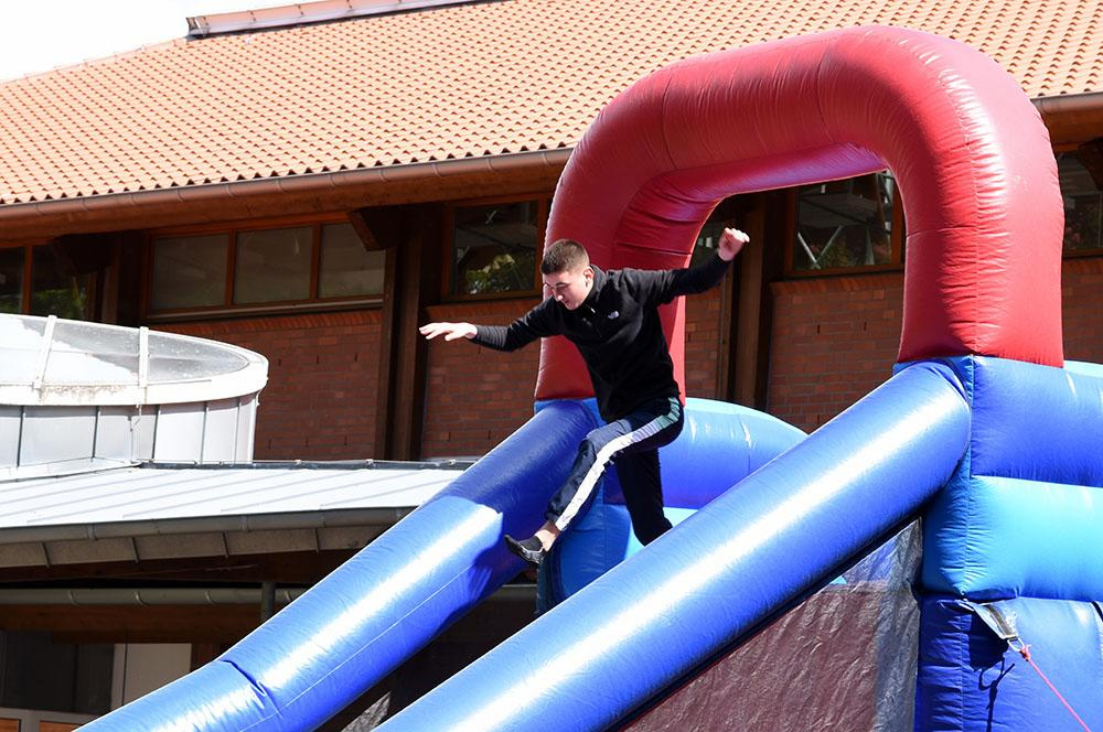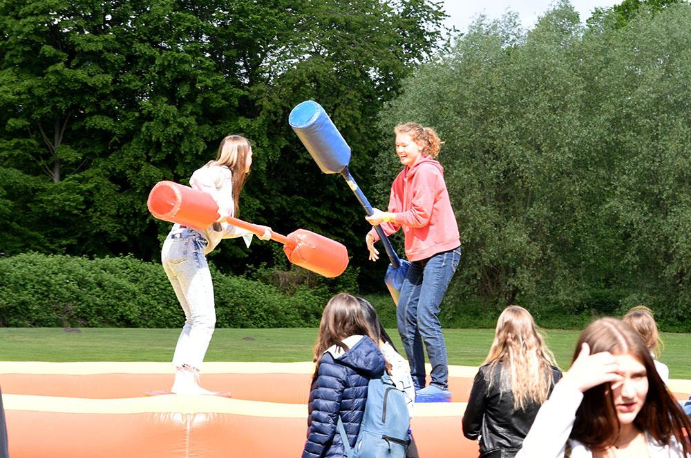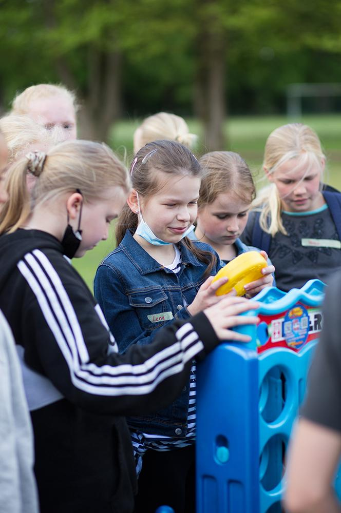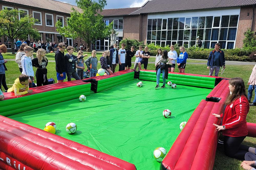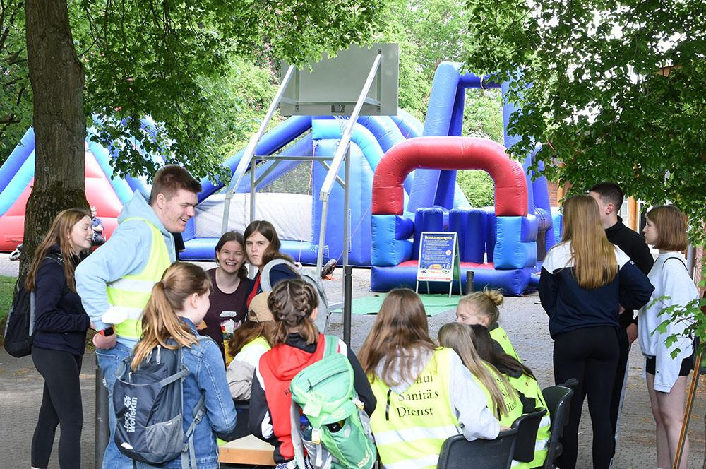 Das erklärte Ziel des Teamtages, der von der Schülervertretung angeregt und maßgeblich organisiert worden war, bestand darin, nach mehr als zwei Jahren mit Corona den Teamgeist der Schüler*innen zu stärken. Um dies zu erreichen, traten die Teams, die zwischen 16 und 20 Spieler*innen umfassten, an den verschiedenen Stationen gegeneinander an. Dabei ging es aber nicht primär darum, unbedingt als Sieger hervorgehen zu wollen, sondern darum, sich gemeinsam den jeweiligen Herausforderungen zu stellen. Zu den Attraktionen gehörten sowohl weitverbreitete Spiele wie „Vier gewinnt“, „Hau den Lukas“ oder Tischkicker, die hier allerdings in Großformat zum Einsatz kamen, als auch eher unbekannte Spiele wie etwa der „Sorbing Ball Run“, bei dem die Herausforderung darin besteht, in einem aufblasbaren transparenten Ball einen Rundkurs zu durchlaufen.