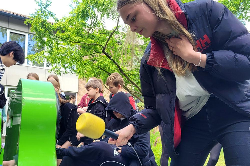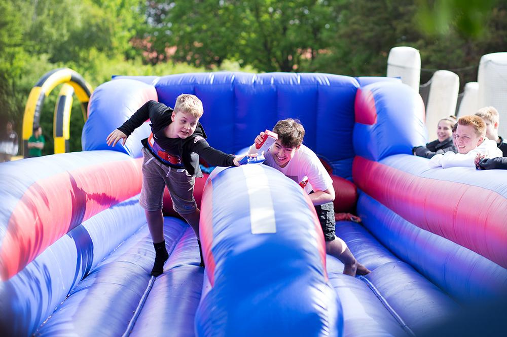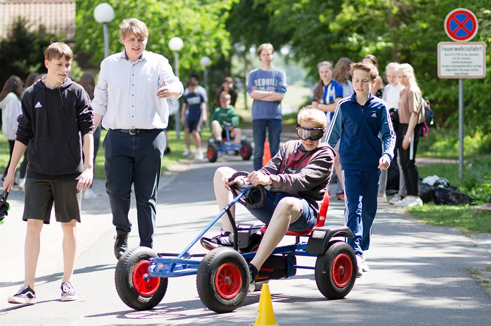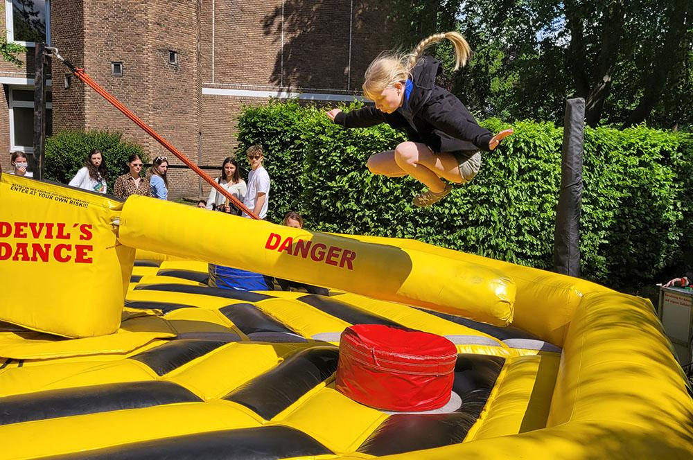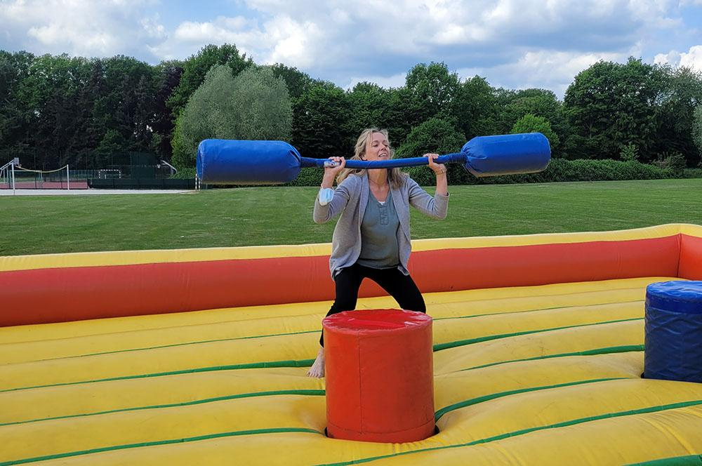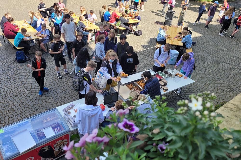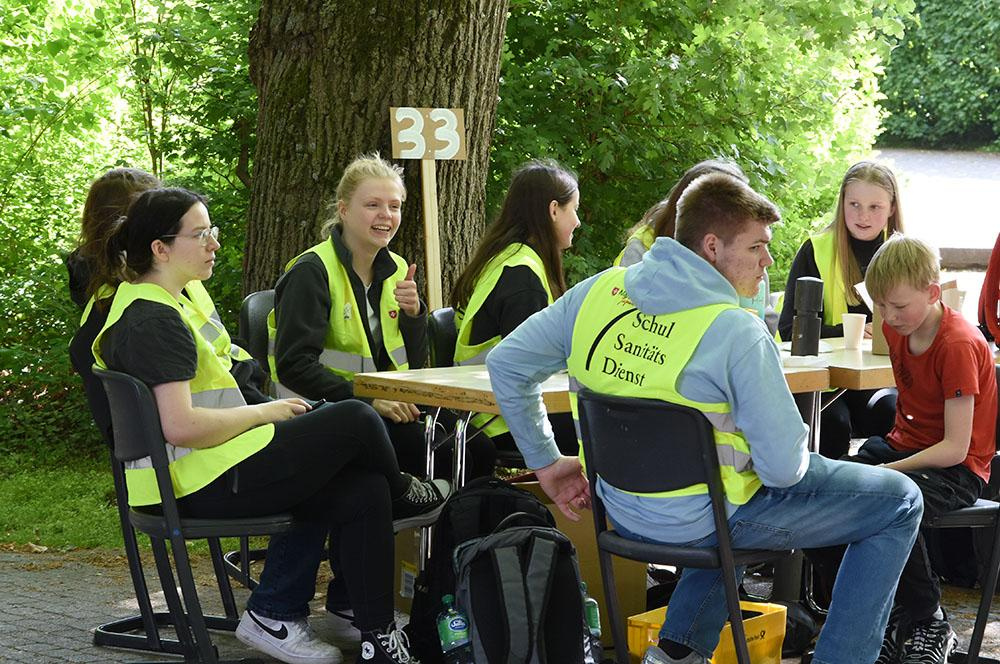 Das erklärte Ziel des Teamtages, der von der Schülervertretung angeregt und maßgeblich organisiert worden war, bestand darin, nach mehr als zwei Jahren mit Corona den Teamgeist der Schüler*innen zu stärken. Um dies zu erreichen, traten die Teams, die zwischen 16 und 20 Spieler*innen umfassten, an den verschiedenen Stationen gegeneinander an. Dabei ging es aber nicht primär darum, unbedingt als Sieger hervorgehen zu wollen, sondern darum, sich gemeinsam den jeweiligen Herausforderungen zu stellen. Zu den Attraktionen gehörten sowohl weitverbreitete Spiele wie „Vier gewinnt“, „Hau den Lukas“ oder Tischkicker, die hier allerdings in Großformat zum Einsatz kamen, als auch eher unbekannte Spiele wie etwa der „Sorbing Ball Run“, bei dem die Herausforderung darin besteht, in einem aufblasbaren transparenten Ball einen Rundkurs zu durchlaufen.