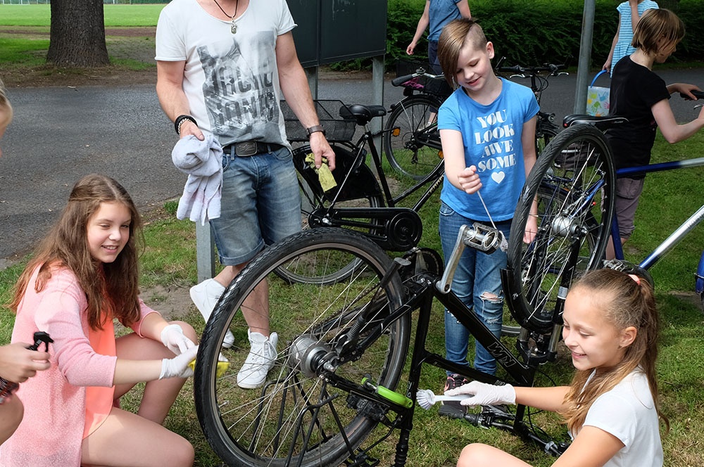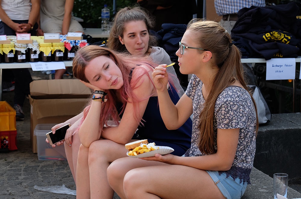 Traditionellerweise gab es wieder eine bunte Spielwiese, welche Schüler und Eltern der Unterstufenklassen mit kreativen Ideen füllten. Das Angebot reichte vom Glücksrad übers Entenangeln und Nägelschlagen bis zur Mäusefallenchallenge und verschiedenen weiteren Spielen. Besonders großen Anklang fand auch der Fahrrad-Putzstand der Klasse 5c, wo jede Leeze anschließend mit der Sonne um die Wette strahlte während die Kunden sich an Smothies laben konnten. Ein weiteres absolutes Highlight bestand dank der Unterstützung von der Familie Krause für die kleinen Gäste darin, die beeindruckenden Loburger Anlagen vom Rücken zweier kinderliebender Ponys zu erkunden.