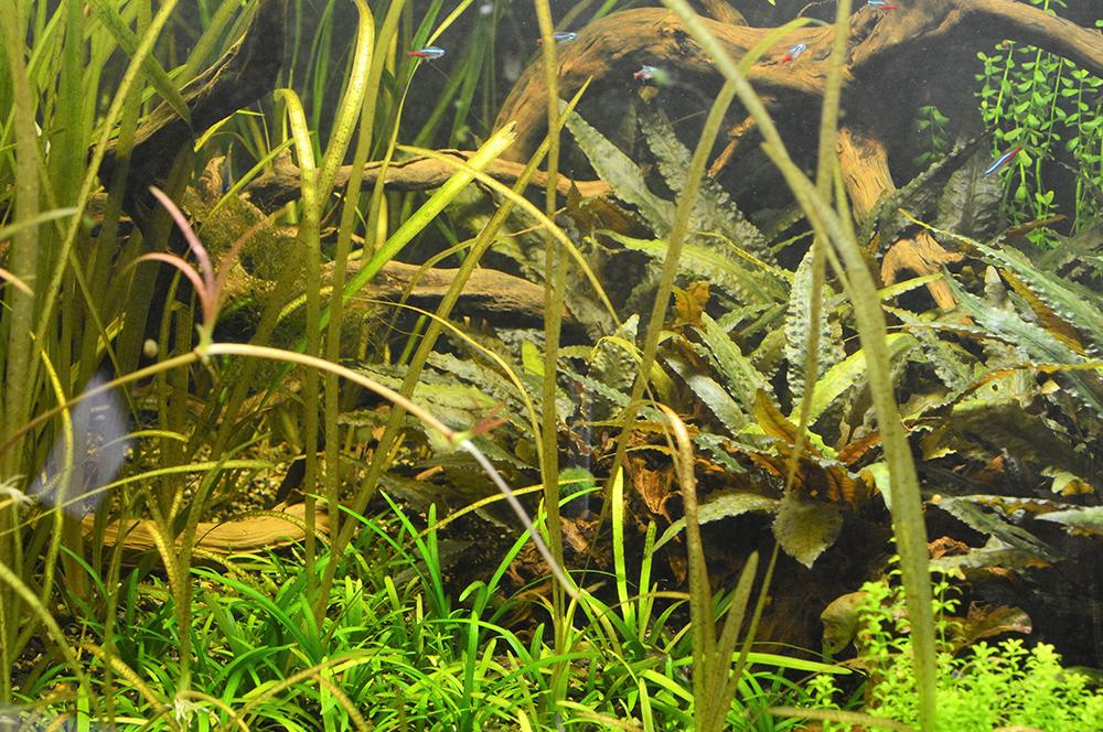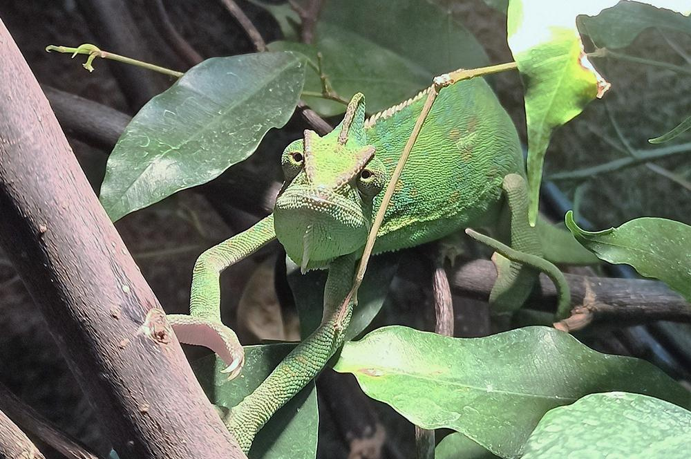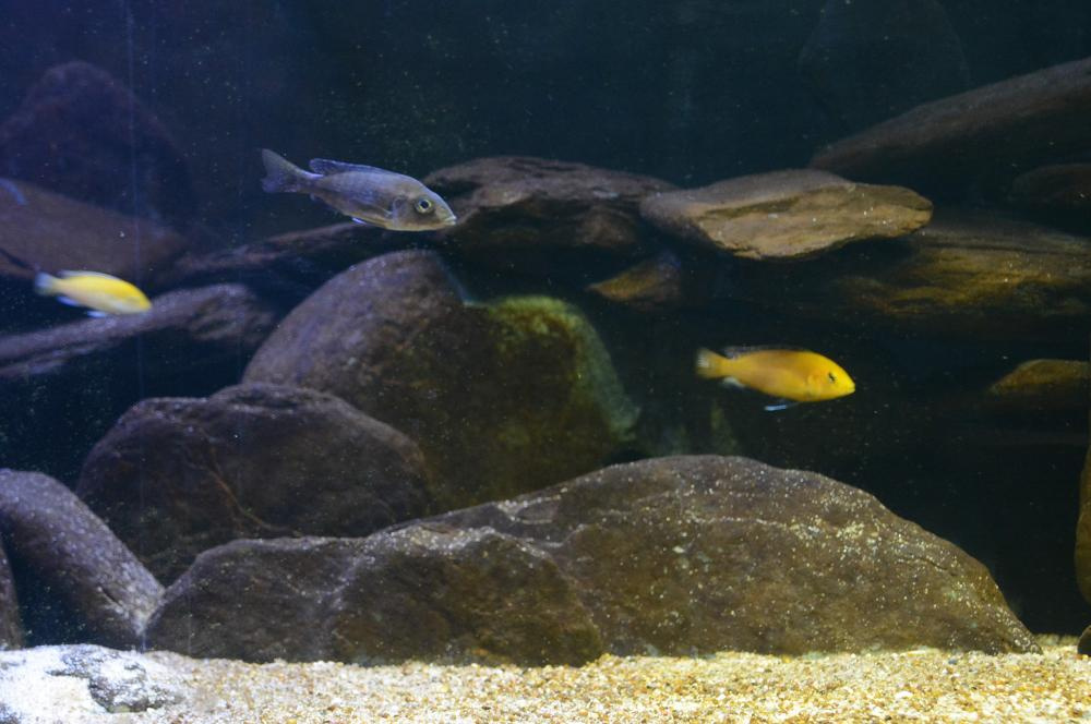 weibliches Jemen-Chamäleon "Renate"; weiblicher Gelber Maulbrüter mit Gelege im Maul (Foto: Maja-Luisa Bürger); Gesellschaftsaquarium mit Endler Guppys, Neons, Panzerwelsen, Antennenwelsen, Zwergguramis, Siamesischen Rüsselbarben, Garnelen und Schnecken;