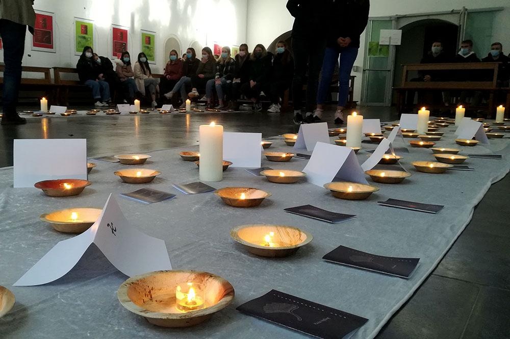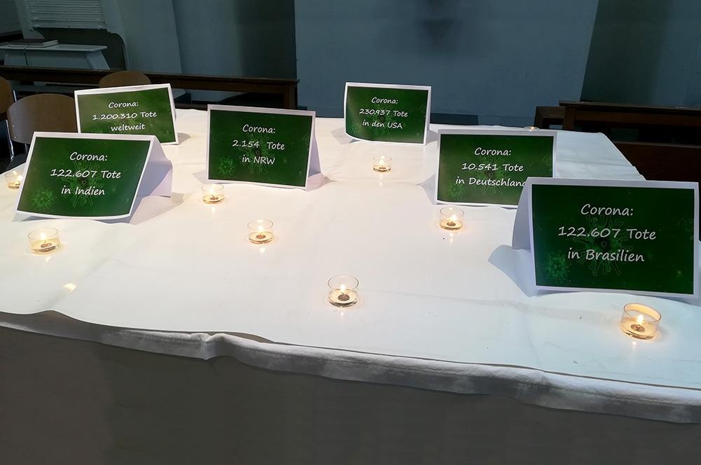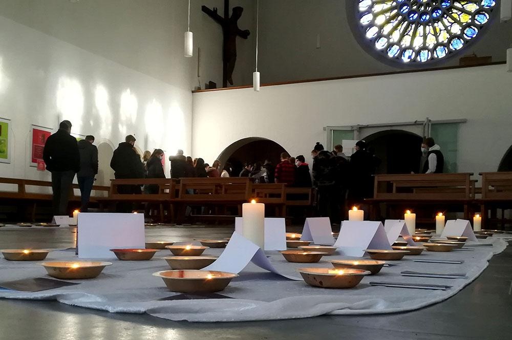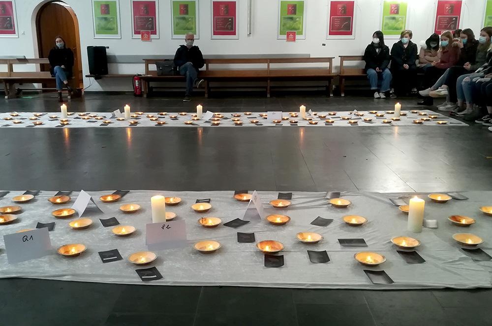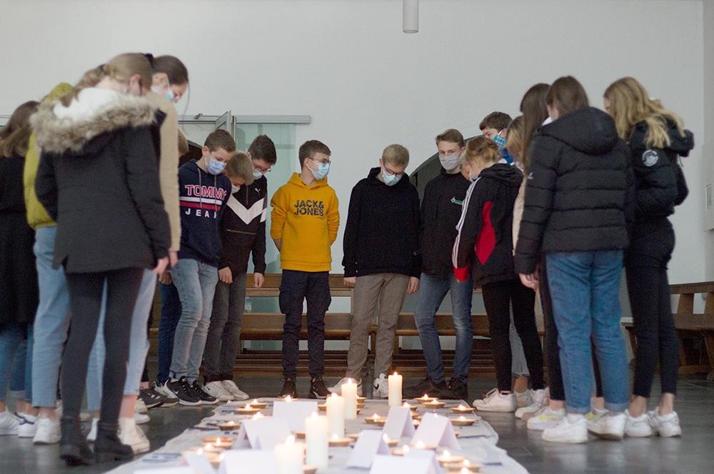 Die Schülerinnen und Schüler hatten nach einführenden Worten durch Wolfgang Rensinghoff die Möglichkeit, ein paar Minuten in Stille zu verbringen, in der Kirche herumzugehen und einzelne Karten zu betrachten oder vor dem Altar bei den Zahlen der Coronatoten innezuhalten. Ein besonderes Gedenken galt an diesem Tag dem ermordeten französischen Geschichtslehrer Samuel Paty.