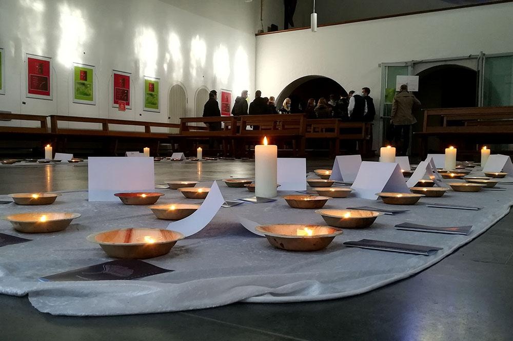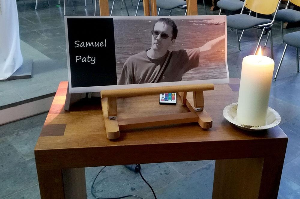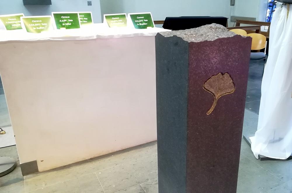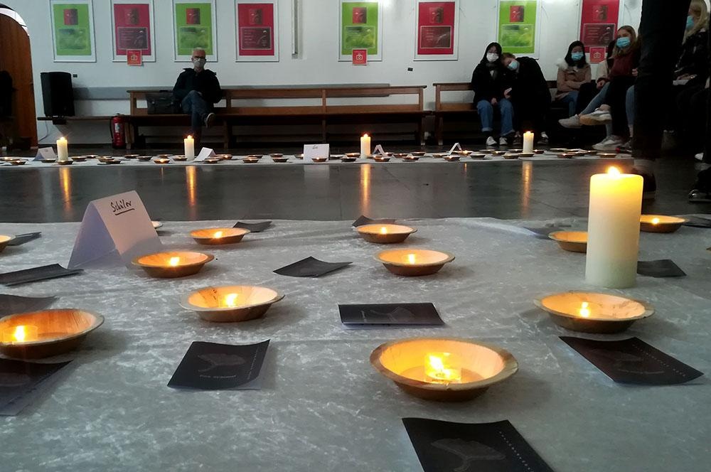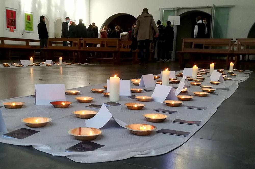 Die Schülerinnen und Schüler hatten nach einführenden Worten durch Wolfgang Rensinghoff die Möglichkeit, ein paar Minuten in Stille zu verbringen, in der Kirche herumzugehen und einzelne Karten zu betrachten oder vor dem Altar bei den Zahlen der Coronatoten innezuhalten. Ein besonderes Gedenken galt an diesem Tag dem ermordeten französischen Geschichtslehrer Samuel Paty.