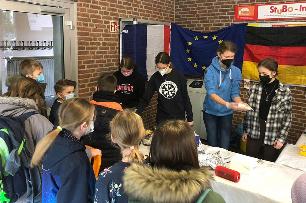 Der Französisch Grundkurs der Q1 hat daher am Freitag in unserer Schule einen Crêpes Verkauf angeboten. Die Möglichkeit sich in der ersten bzw. zweiten Pause mit dieser französischen Köstlichkeit zu stärken wurde von sehr vielen Schüler*innen der Loburg mit Begeisterung angenommen.