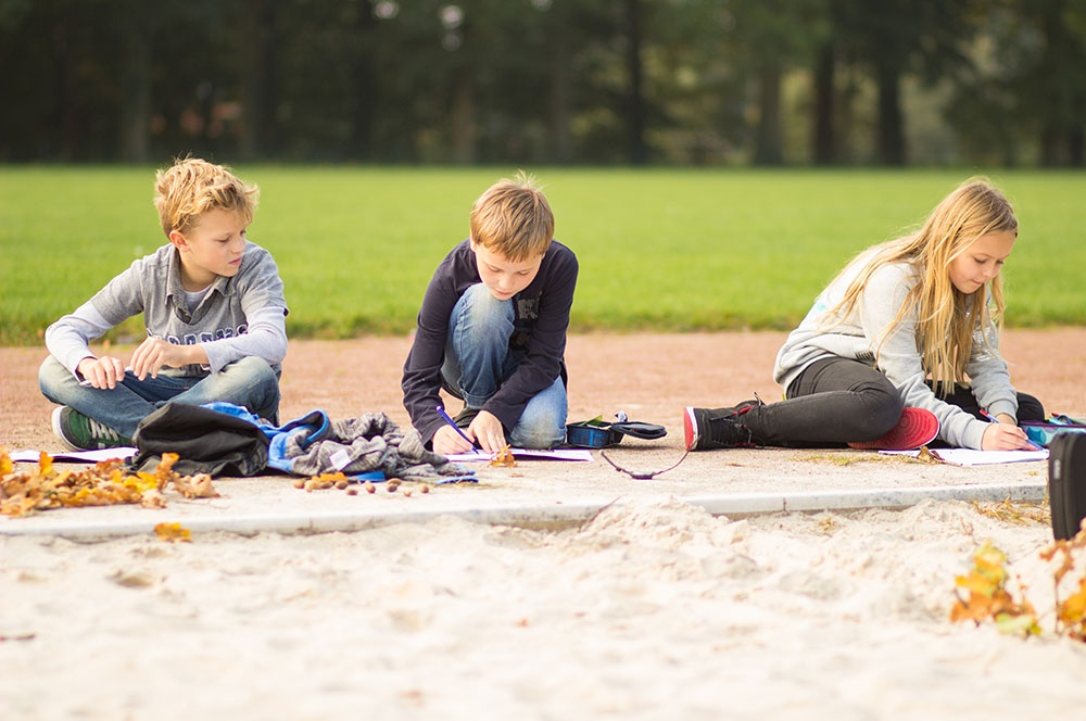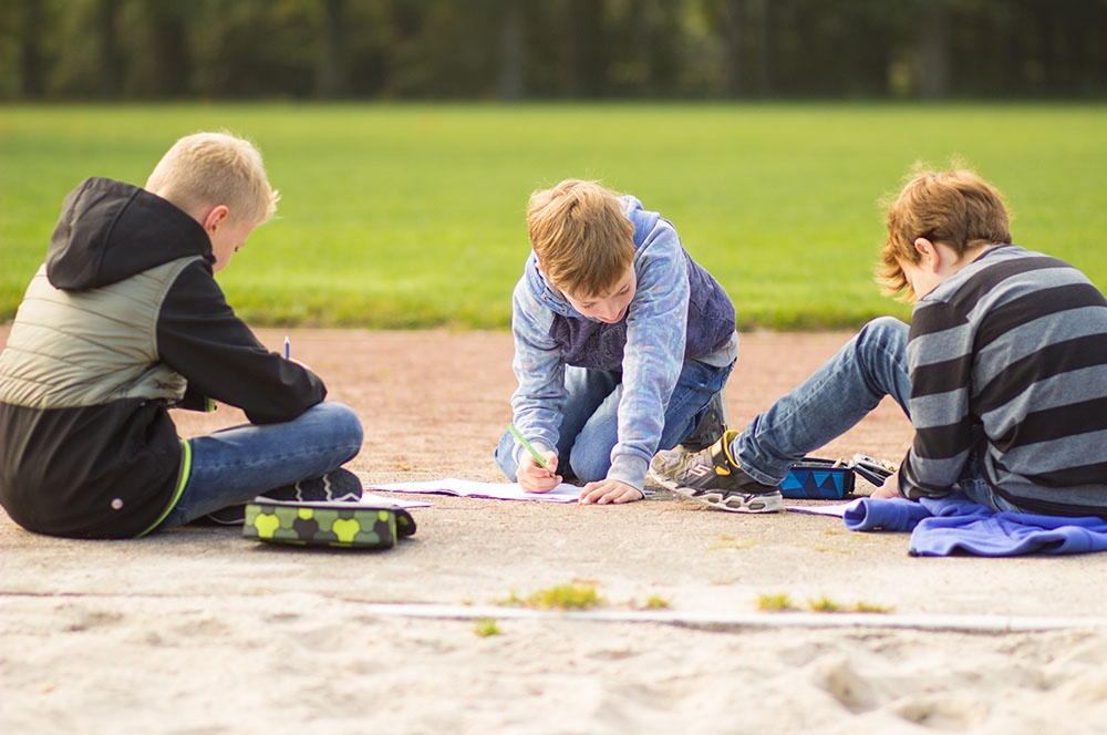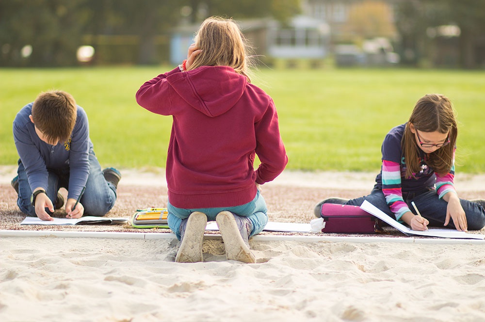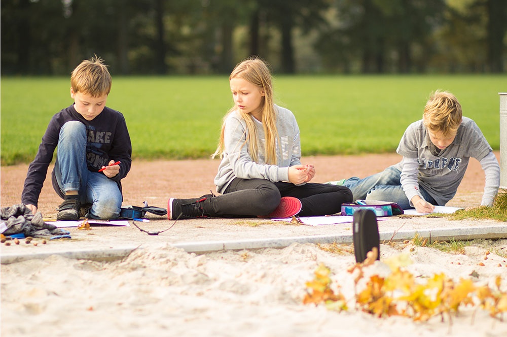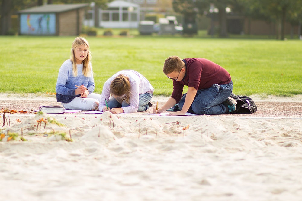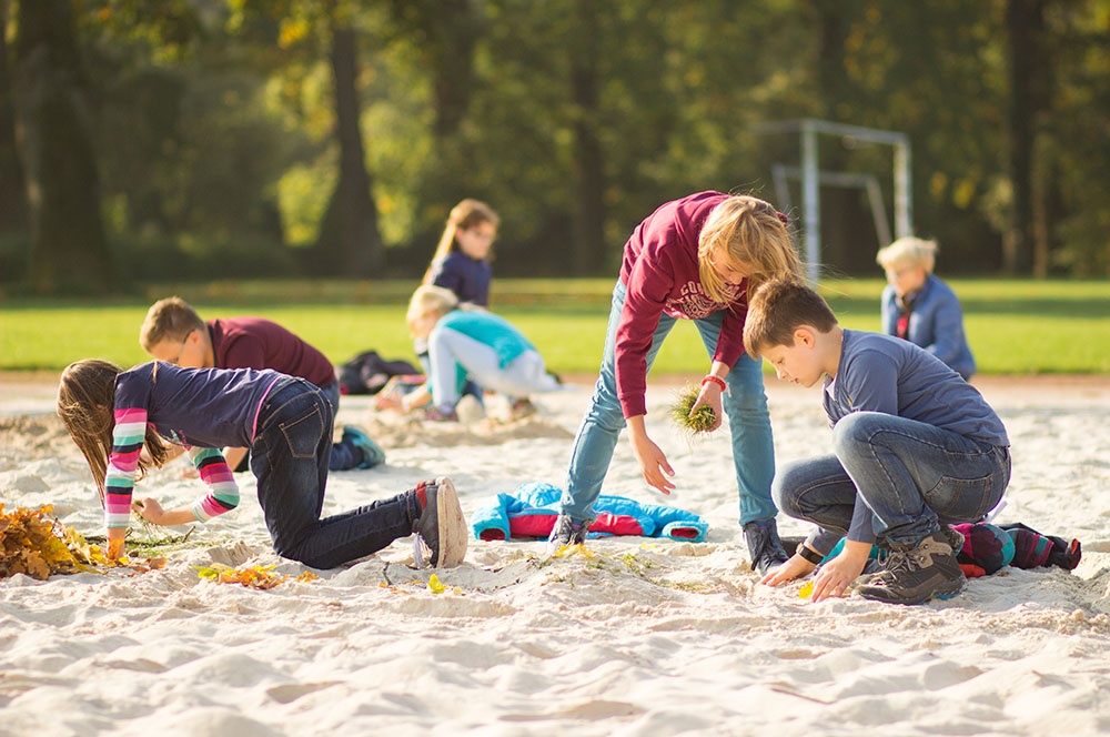 Eine dieser Methoden ist die Unterrichtseinheit ‚Von der Landschaft zur Karte‘. Die Schülerinnen und Schüler dürfen in Teams eine Landschaft im Volleyballfeld der Loburg erstellen. Die Kinder können hierbei ihrer Fantasie freien Lauf lassen, einzige Bedingung ist die Gestaltung von Hügeln innerhalb der selbstentworfenen Landschaft. So kommen die Kinder zu kreativen Elementen wie dem bunten Berg, der Elefantenwiese oder der berüchtigte Berg-City.